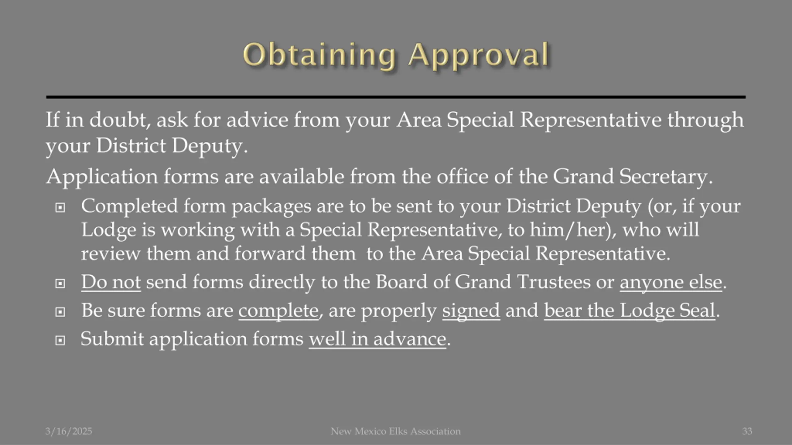 If in doubt, ask for advice from your Area Special Representative through your District Deputy. Application forms are available from the office of the Grand Secretary. Completed form packages are to be sent to your District Deputy (or, if your Lodge is working with a Special Representative, to him/her), who will review them and forward them to the Area Special Representative. Do not send forms directly to the Board of Grand Trustees or anyone else. Be sure forms are complete, are properly signed and bear the Lodge Seal. Submit application forms well in advance. 3/16/2025 New Mexico Elks Association 33