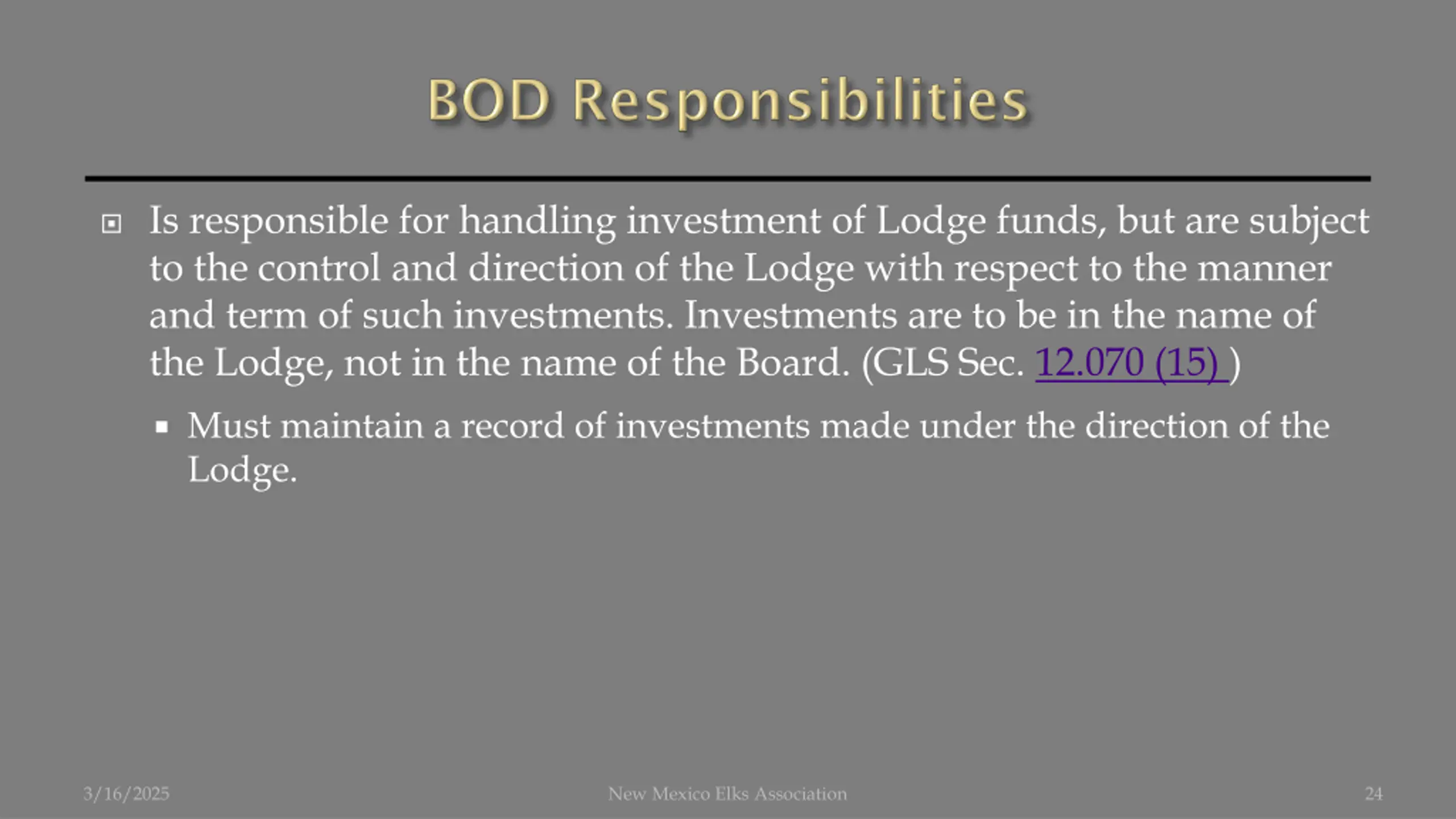 Is responsible for handling investment of Lodge funds, but are subject to the control and direction of the Lodge with respect to the manner and term of such investments. Investments are to be in the name of the Lodge, not in the name of the Board. (GLS Sec. 12.070 (15) ) Must maintain a record of investments made under the direction of the Lodge. 3/16/2025 New Mexico Elks Association 24
