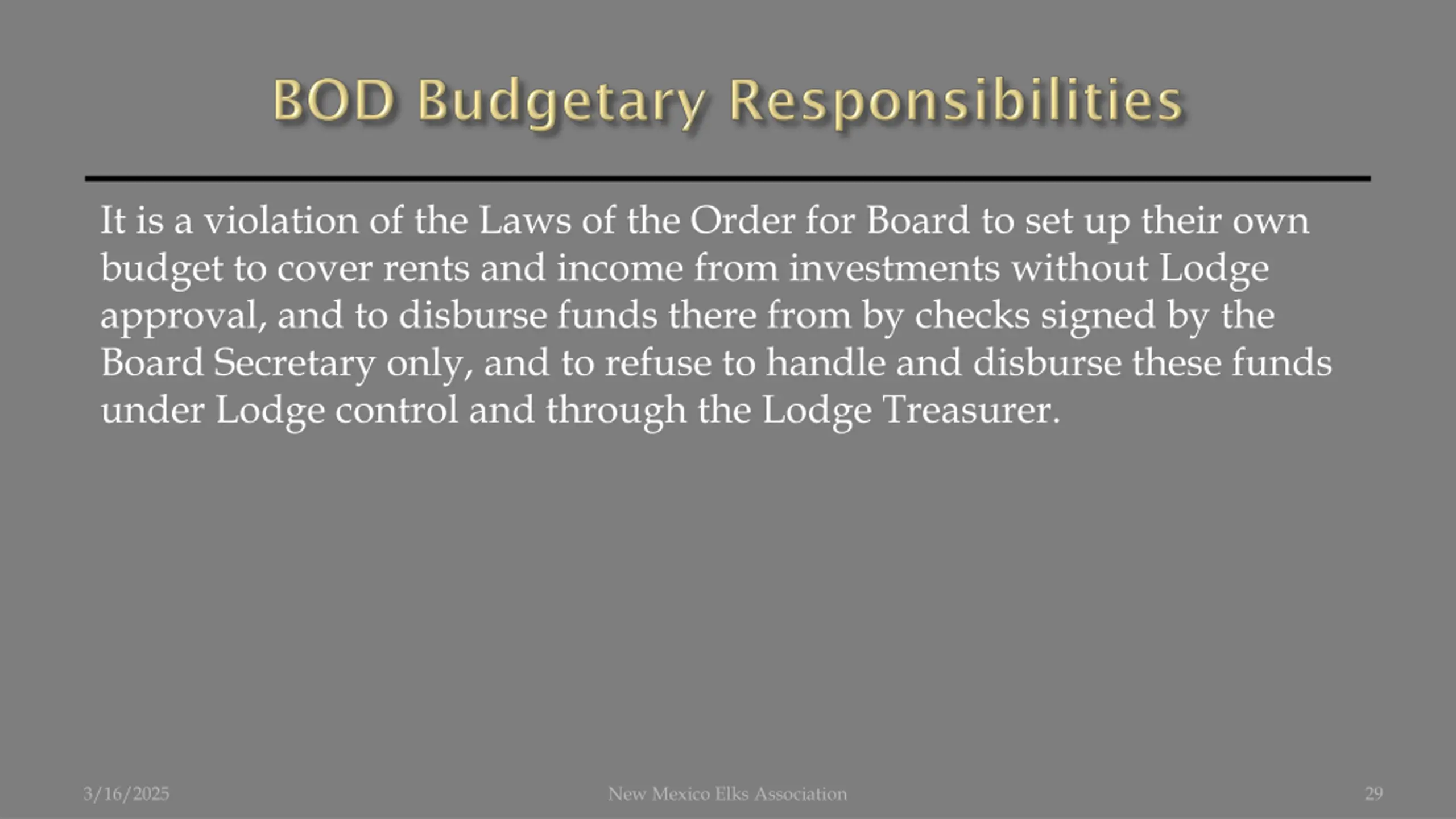 It is a violation of the Laws of the Order for Board to set up their own budget to cover rents and income from investments without Lodge approval, and to disburse funds there from by checks signed by the Board Secretary only, and to refuse to handle and disburse these funds under Lodge control and through the Lodge Treasurer. 3/16/2025 New Mexico Elks Association 29