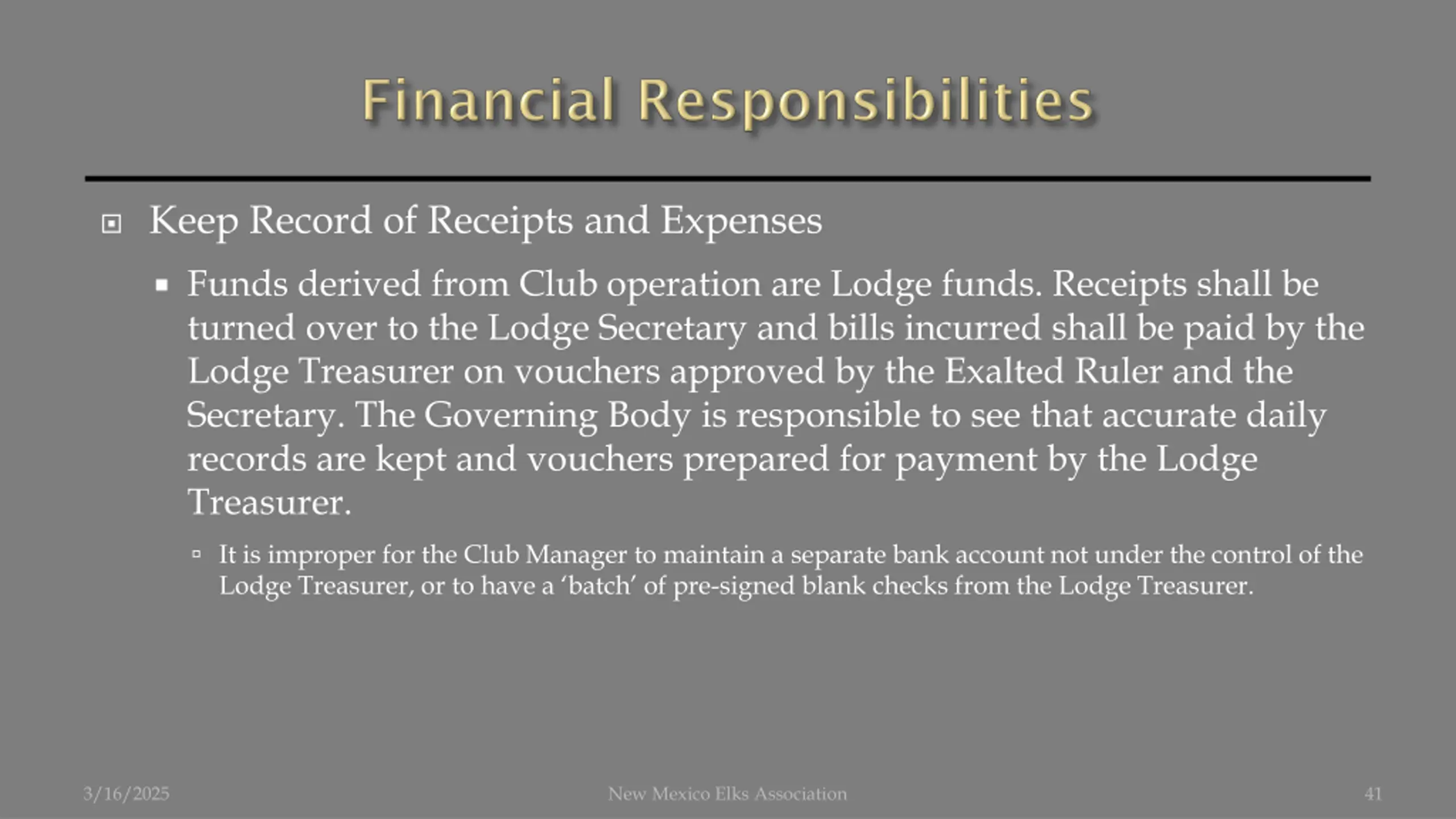 Keep Record of Receipts and Expenses Funds derived from Club operation are Lodge funds. Receipts shall be turned over to the Lodge Secretary and bills incurred shall be paid by the Lodge Treasurer on vouchers approved by the Exalted Ruler and the Secretary. The Governing Body is responsible to see that accurate daily records are kept and vouchers prepared for payment by the Lodge Treasurer. It is improper for the Club Manager to maintain a separate bank account not under the control of the Lodge Treasurer, or to have a batch of pre-signed blank checks from the Lodge Treasurer. 3/16/2025 New Mexico Elks Association 41