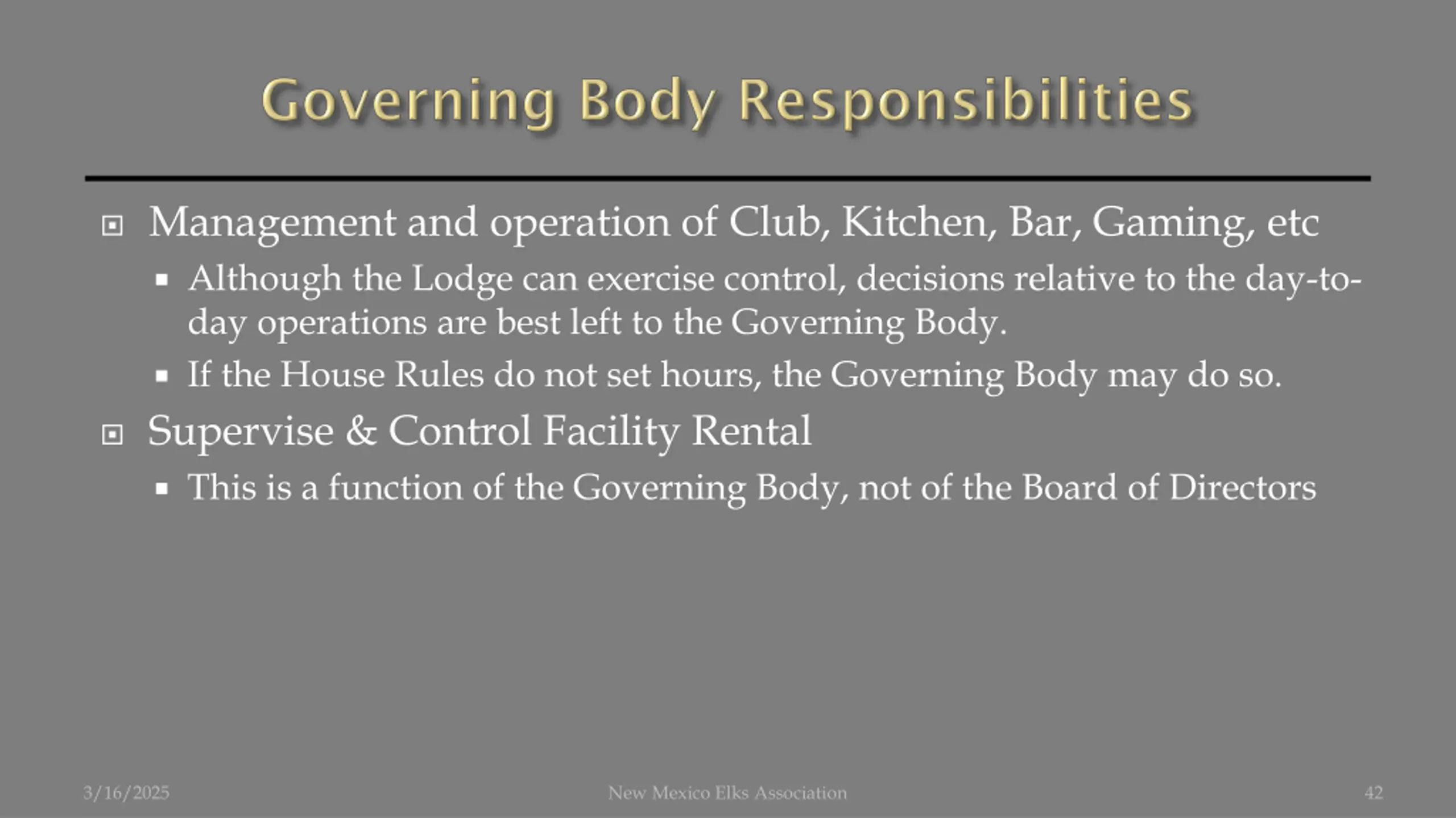 Management and operation of Club, Kitchen, Bar, Gaming, etc Although the Lodge can exercise control, decisions relative to the day-to- day operations are best left to the Governing Body. If the House Rules do not set hours, the Governing Body may do so. Supervise & Control Facility Rental This is a function of the Governing Body, not of the Board of Directors 3/16/2025 New Mexico Elks Association 42