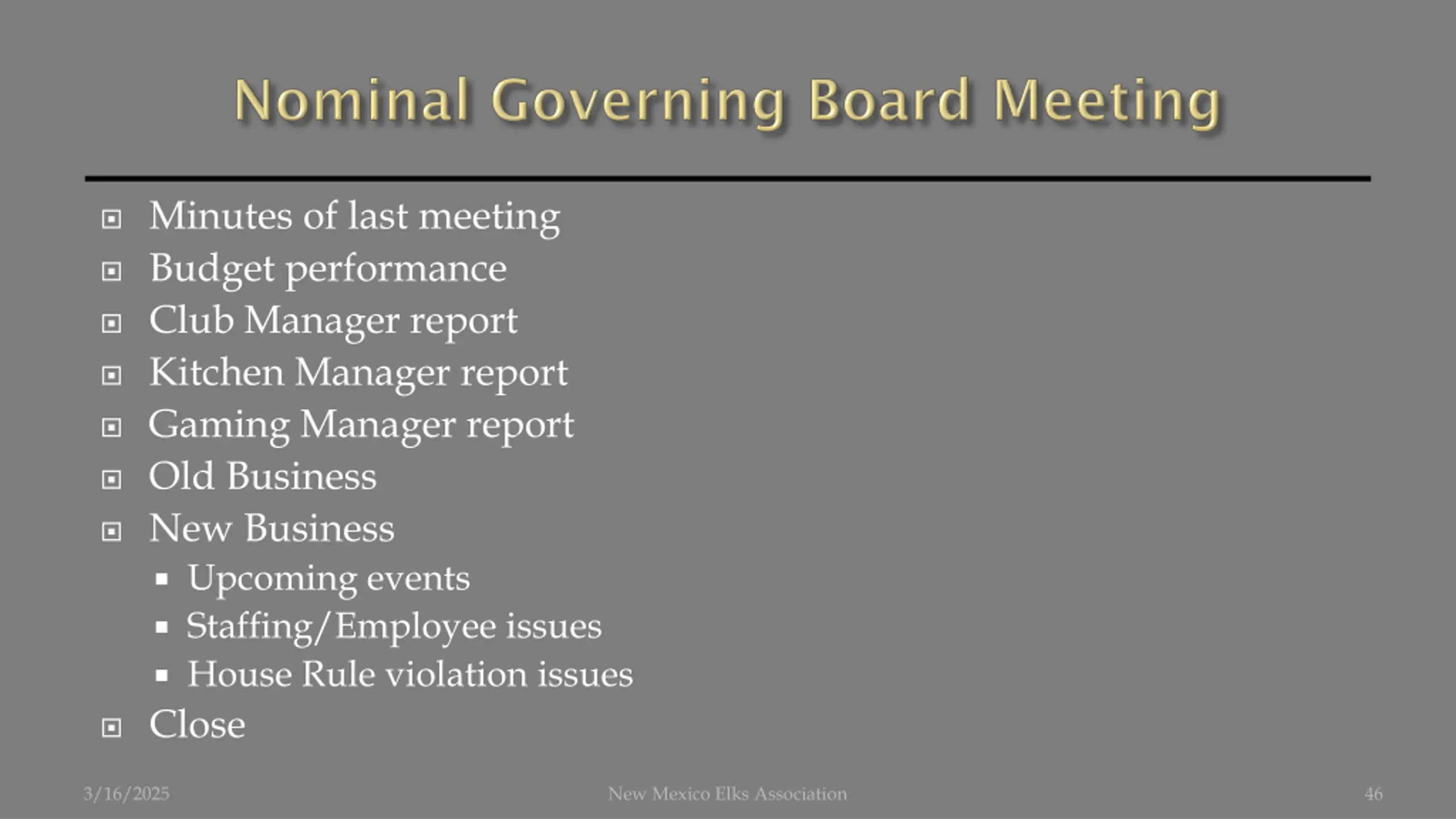 Minutes of last meeting Budget performance Club Manager report Kitchen Manager report Gaming Manager report Old Business New Business Upcoming events Staffing/Employee issues House Rule violation issues Close 3/16/2025 New Mexico Elks Association 46