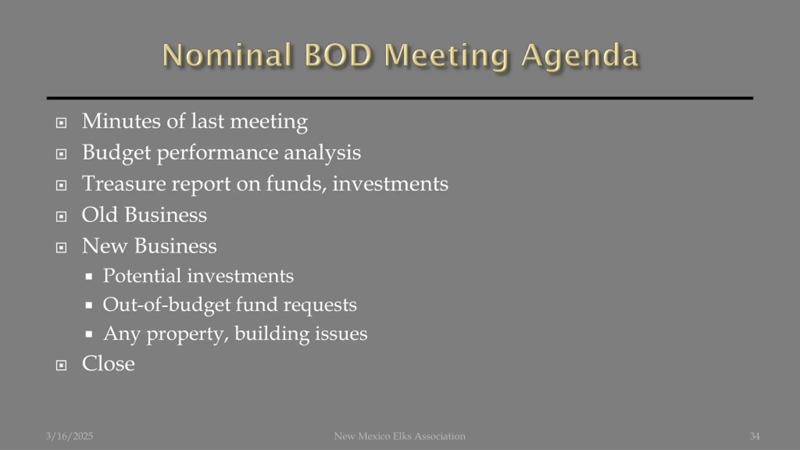 Minutes of last meeting Budget performance analysis Treasure report on funds, investments Old Business New Business Potential investments Out-of-budget fund requests Any property, building issues Close 3/16/2025 New Mexico Elks Association 34