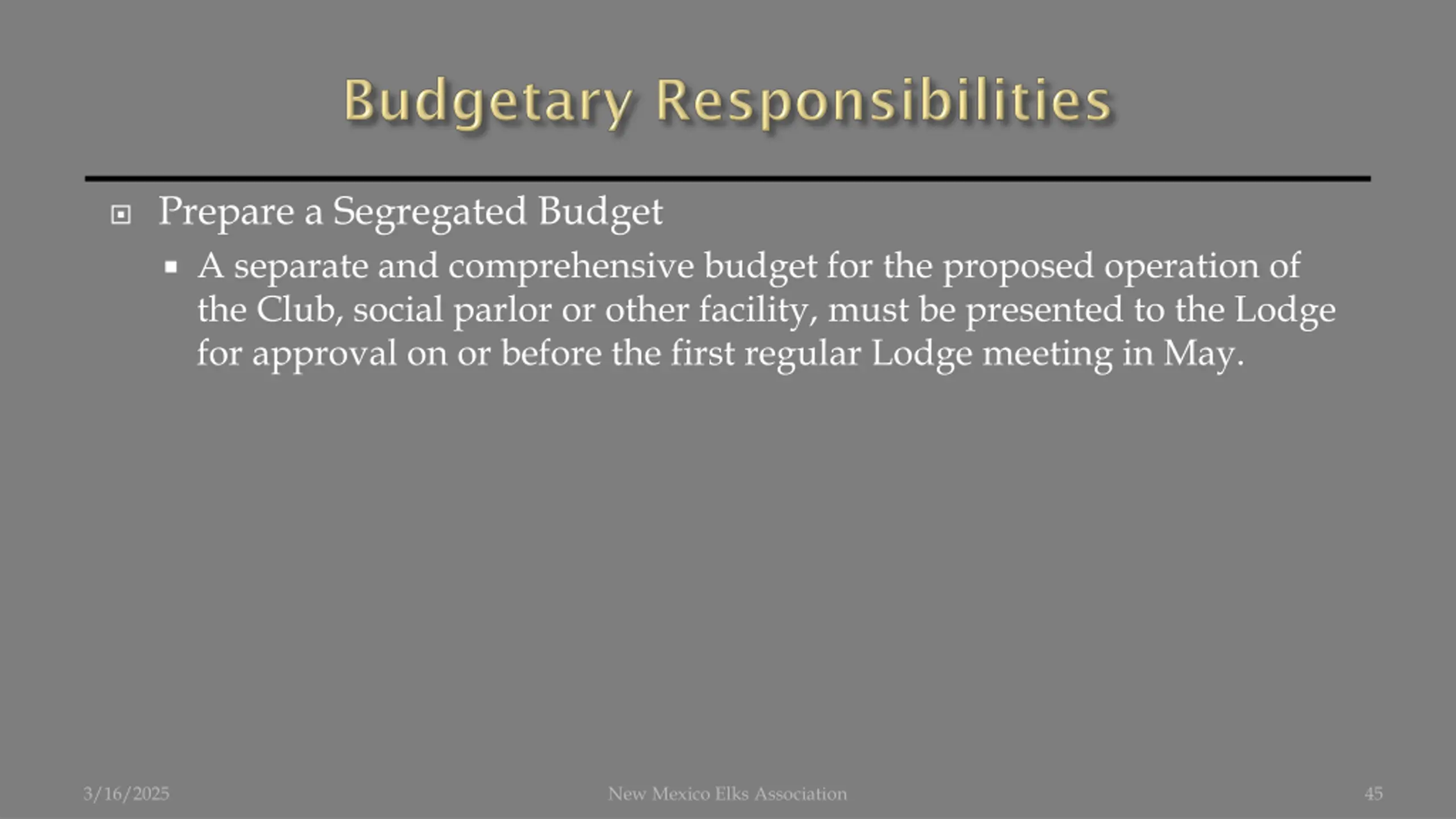 Prepare a Segregated Budget A separate and comprehensive budget for the proposed operation of the Club, social parlor or other facility, must be presented to the Lodge for approval on or before the first regular Lodge meeting in May. 3/16/2025 New Mexico Elks Association 45