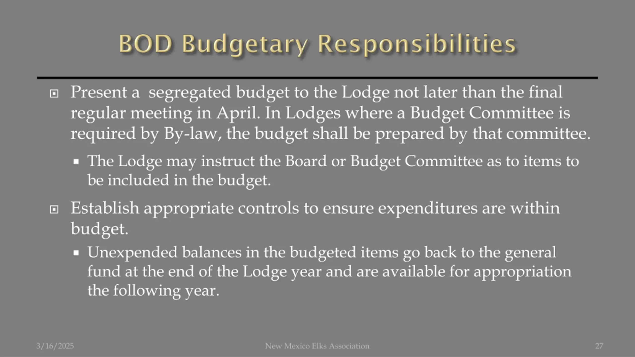 Present a segregated budget to the Lodge not later than the final regular meeting in April. In Lodges where a Budget Committee is required by By-law, the budget shall be prepared by that committee. The Lodge may instruct the Board or Budget Committee as to items to be included in the budget. Establish appropriate controls to ensure expenditures are within budget. Unexpended balances in the budgeted items go back to the general fund at the end of the Lodge year and are available for appropriation the following year. 3/16/2025 New Mexico Elks Association 27