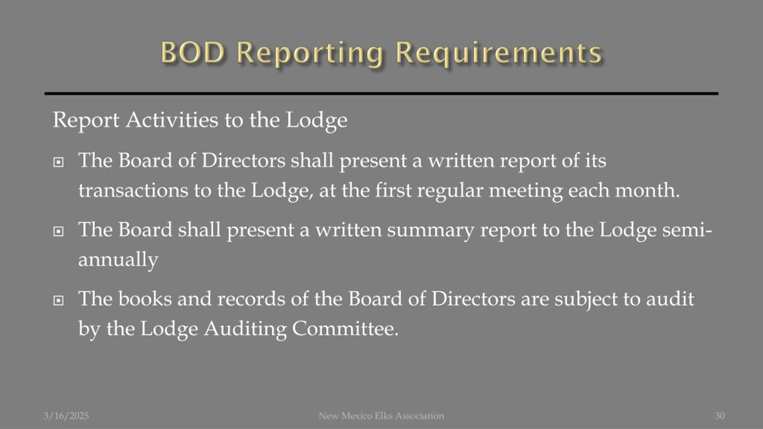 Report Activities to the Lodge The Board of Directors shall present a written report of its transactions to the Lodge, at the first regular meeting each month. The Board shall present a written summary report to the Lodge semi- annually The books and records of the Board of Directors are subject to audit by the Lodge Auditing Committee. 3/16/2025 New Mexico Elks Association 30