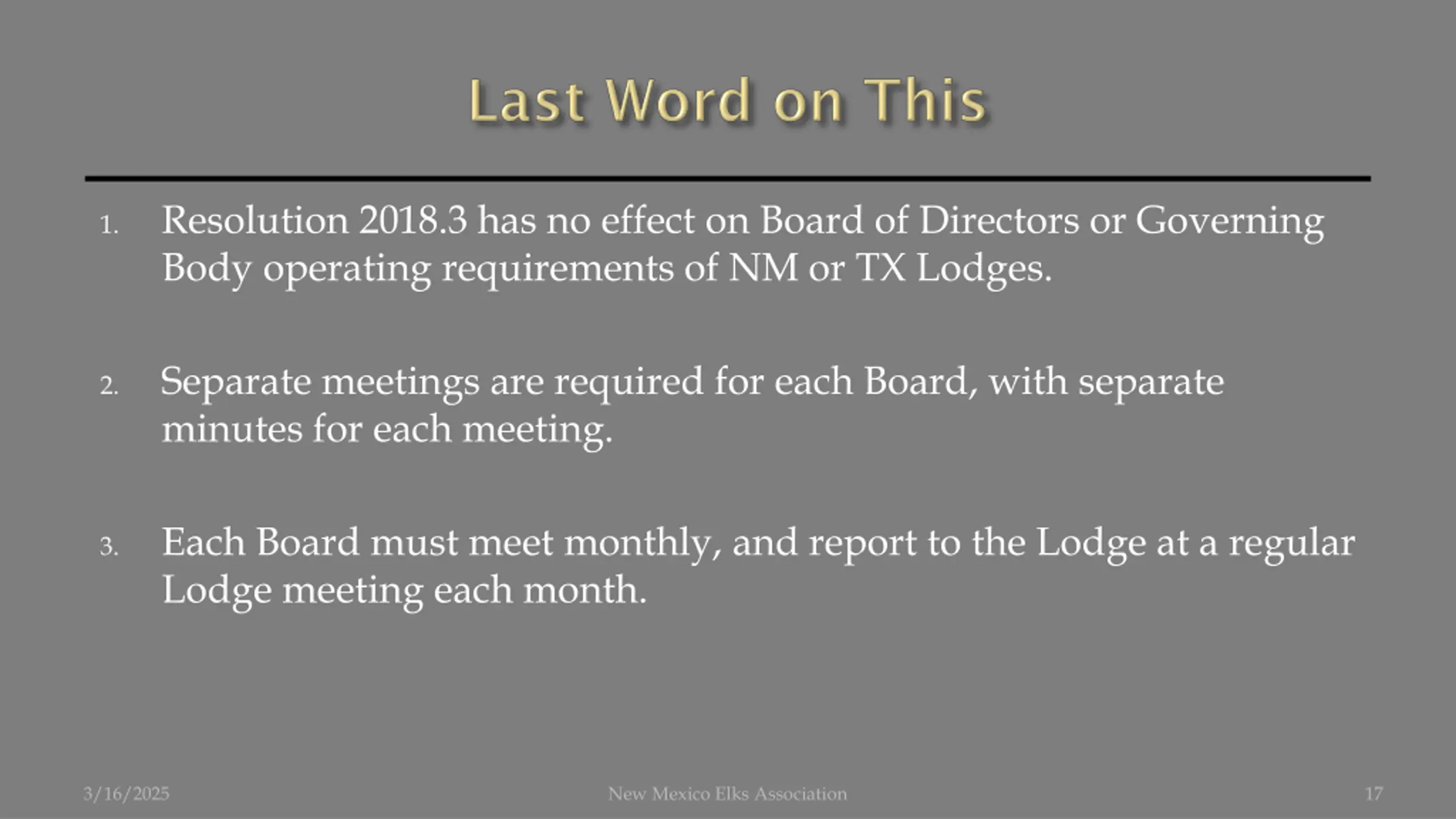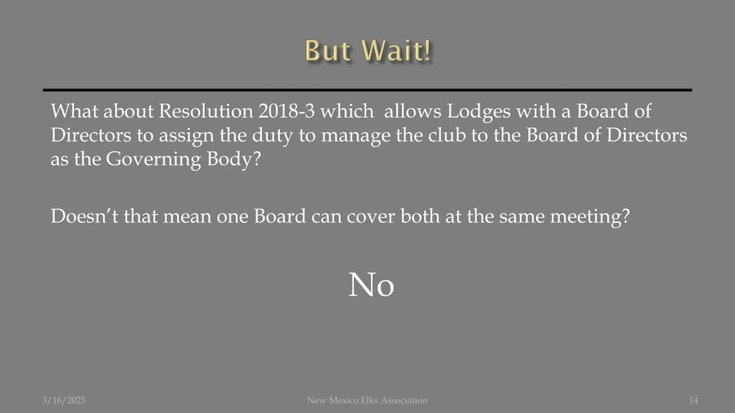 What about Resolution 2018-3 which allows Lodges with a Board of Directors to assign the duty to manage the club to the Board of Directors as the Governing Body? Doesn t that mean one Board can cover both at the same meeting? No 3/16/2025 New Mexico Elks Association 14