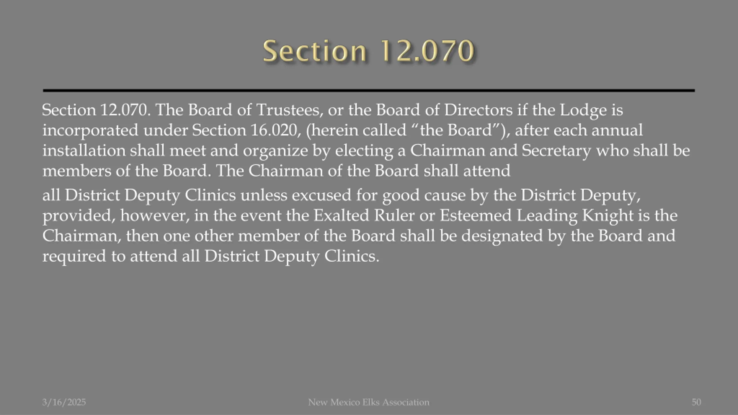 Section 12.070. The Board of Trustees, or the Board of Directors if the Lodge is incorporated under Section 16.020, (herein called the Board ), after each annual installation shall meet and organize by electing a Chairman and Secretary who shall be members of the Board. The Chairman of the Board shall attend all District Deputy Clinics unless excused for good cause by the District Deputy, provided, however, in the event the Exalted Ruler or Esteemed Leading Knight is the Chairman, then one other member of the Board shall be designated by the Board and required to attend all District Deputy Clinics. 3/16/2025 New Mexico Elks Association 50