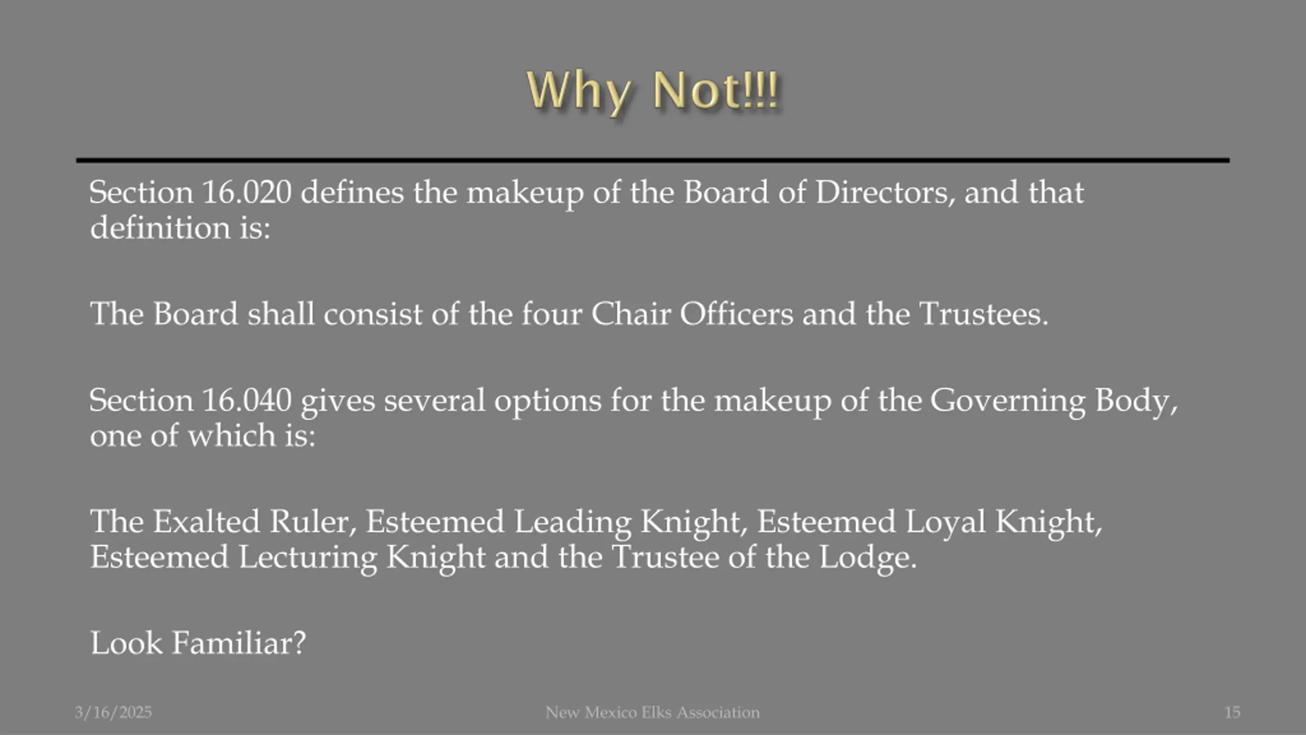 Section 16.020 defines the makeup of the Board of Directors, and that definition is: The Board shall consist of the four Chair Officers and the Trustees. Section 16.040 gives several options for the makeup of the Governing Body, one of which is: The Exalted Ruler, Esteemed Leading Knight, Esteemed Loyal Knight, Esteemed Lecturing Knight and the Trustee of the Lodge. Look Familiar? 3/16/2025 New Mexico Elks Association 15