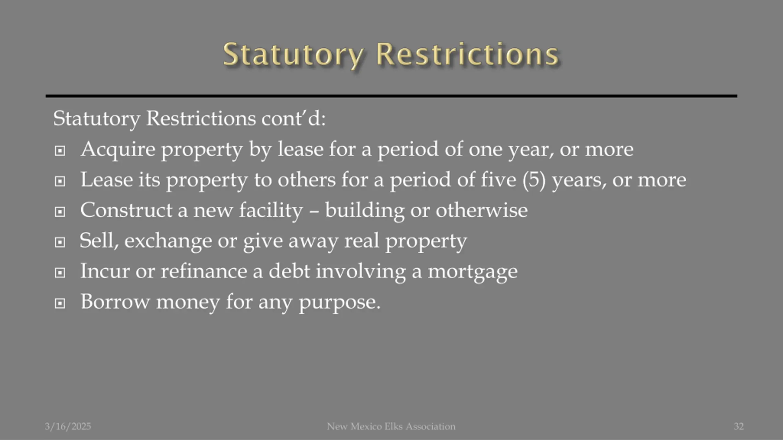 Statutory Restrictions contd: Acquire property by lease for a period of one year, or more Lease its property to others for a period of five (5) years, or more Construct a new facility building or otherwise Sell, exchange or give away real property Incur or refinance a debt involving a mortgage Borrow money for any purpose. 3/16/2025 New Mexico Elks Association 32