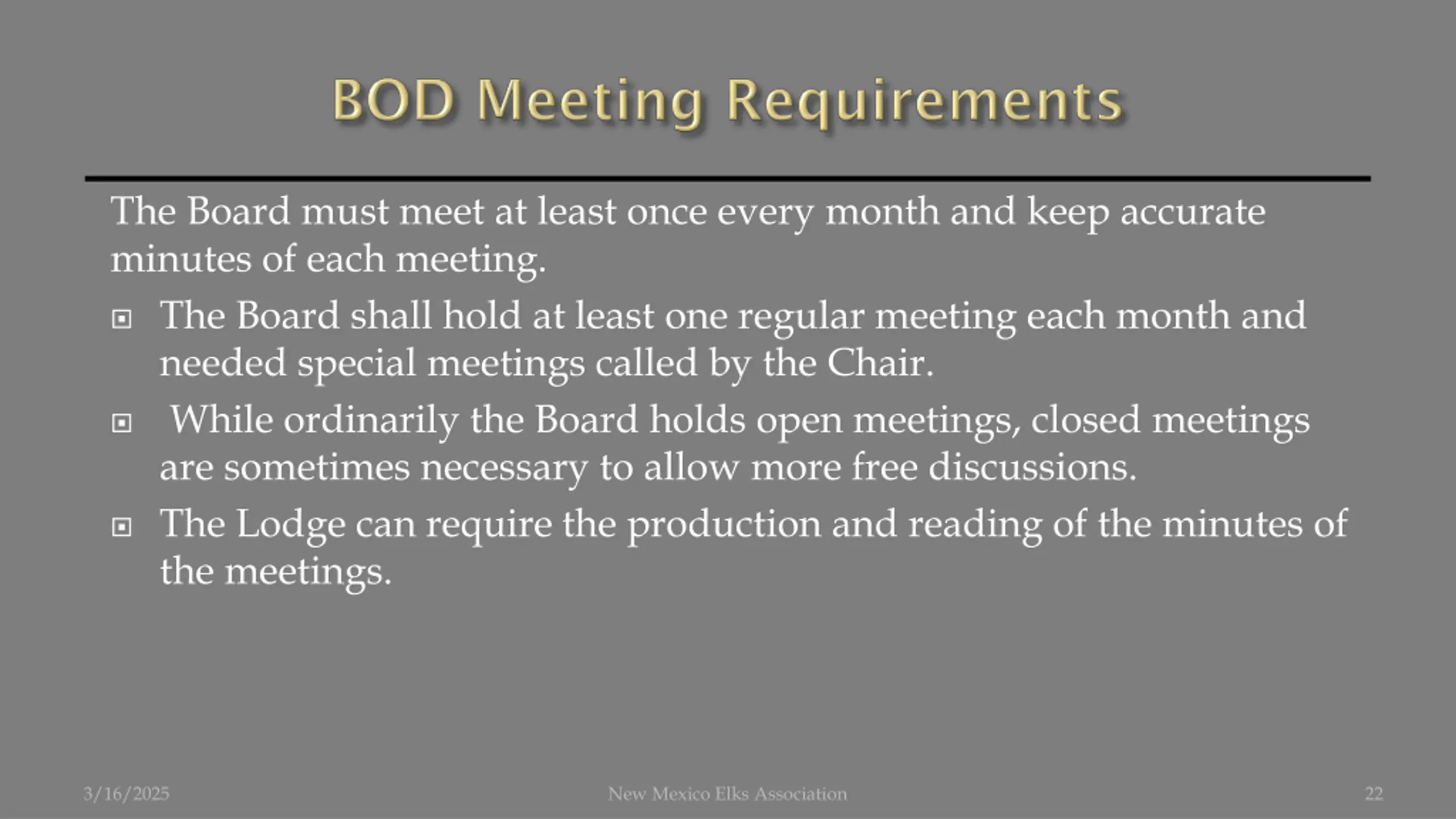 The Board must meet at least once every month and keep accurate minutes of each meeting. The Board shall hold at least one regular meeting each month and needed special meetings called by the Chair. While ordinarily the Board holds open meetings, closed meetings are sometimes necessary to allow more free discussions. The Lodge can require the production and reading of the minutes of the meetings. 3/16/2025 New Mexico Elks Association 22