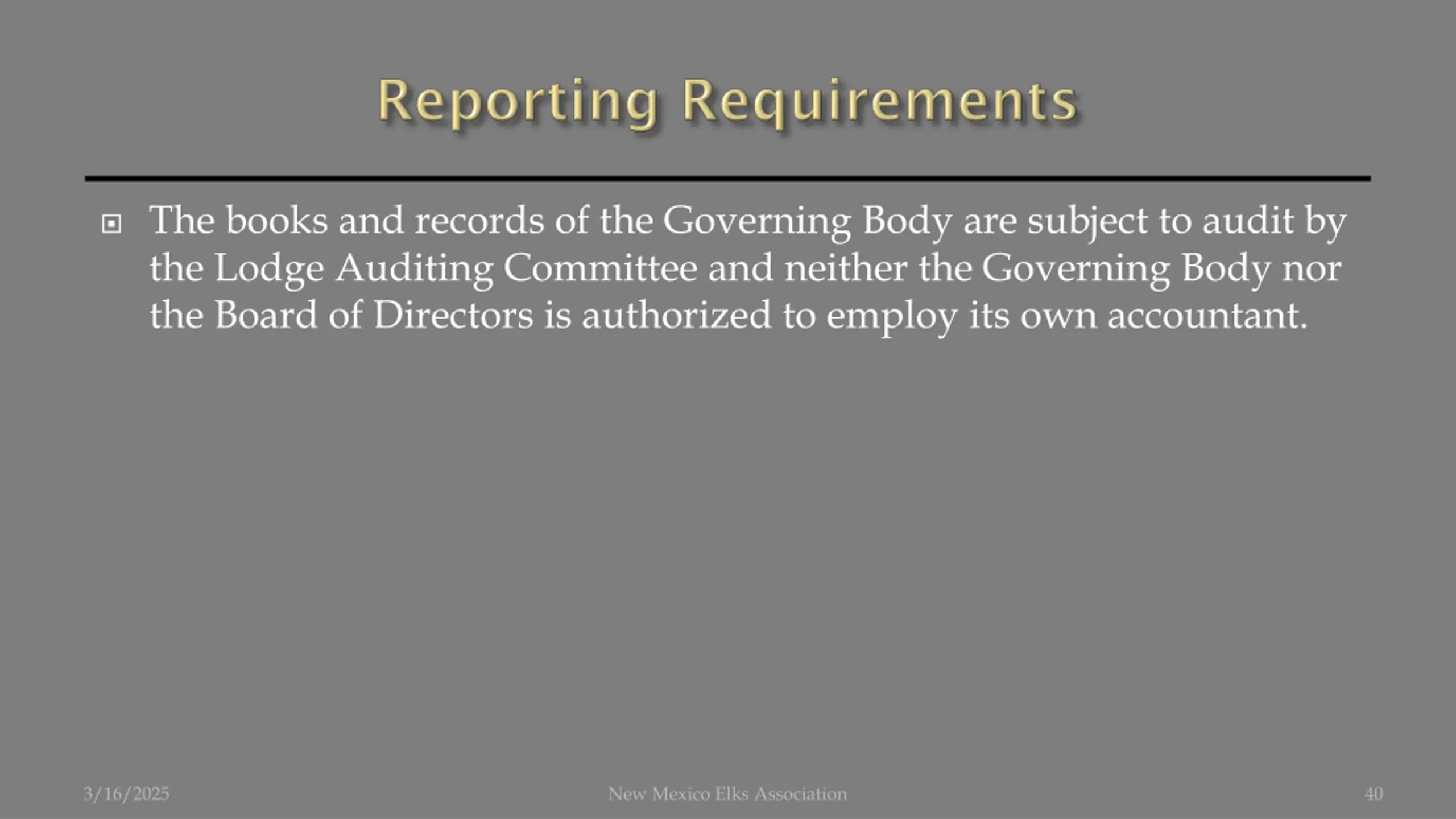 The books and records of the Governing Body are subject to audit by the Lodge Auditing Committee and neither the Governing Body nor the Board of Directors is authorized to employ its own accountant. 3/16/2025 New Mexico Elks Association 40