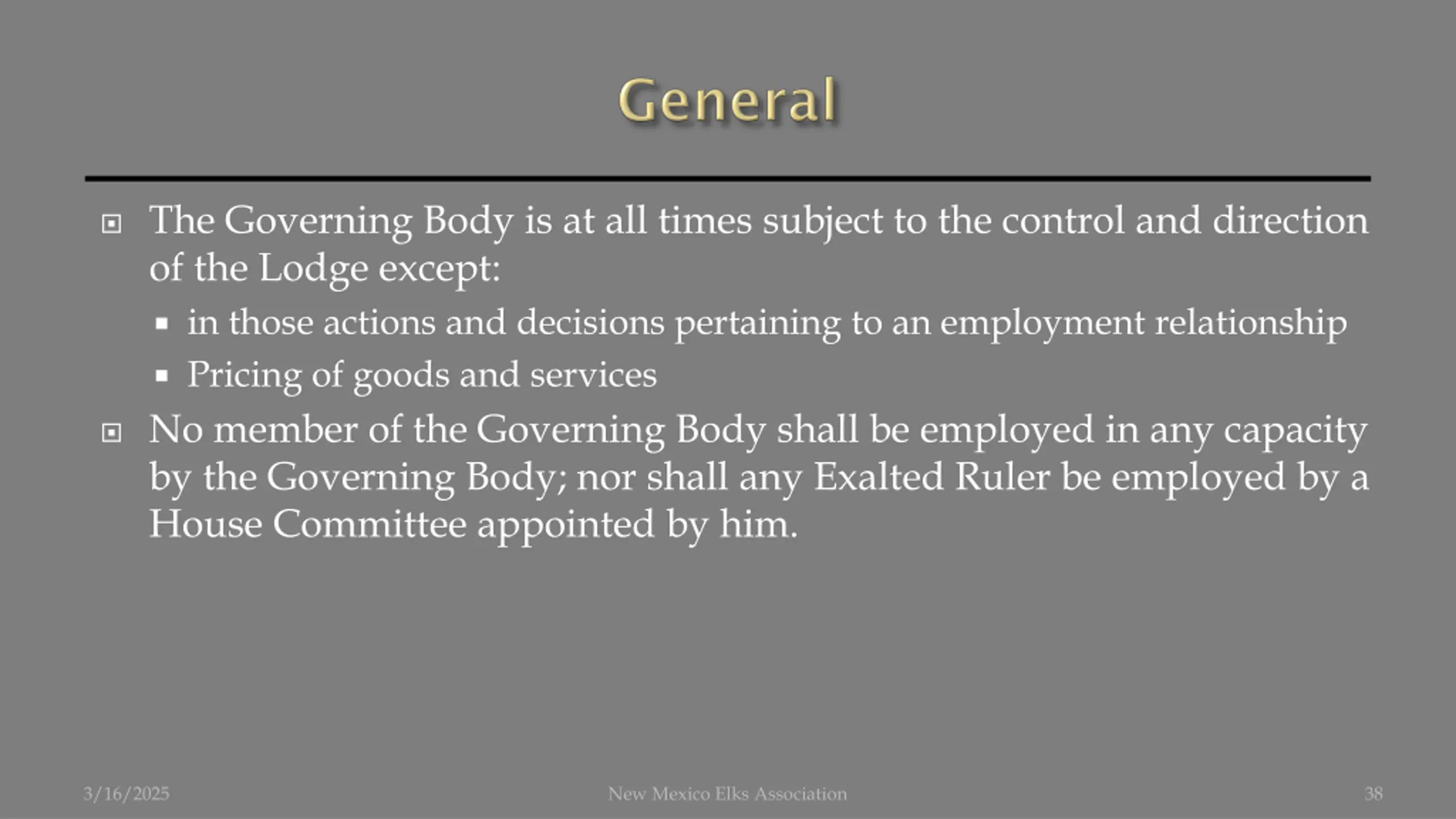 The Governing Body is at all times subject to the control and direction of the Lodge except: in those actions and decisions pertaining to an employment relationship Pricing of goods and services No member of the Governing Body shall be employed in any capacity by the Governing Body; nor shall any Exalted Ruler be employed by a House Committee appointed by him. 3/16/2025 New Mexico Elks Association 38