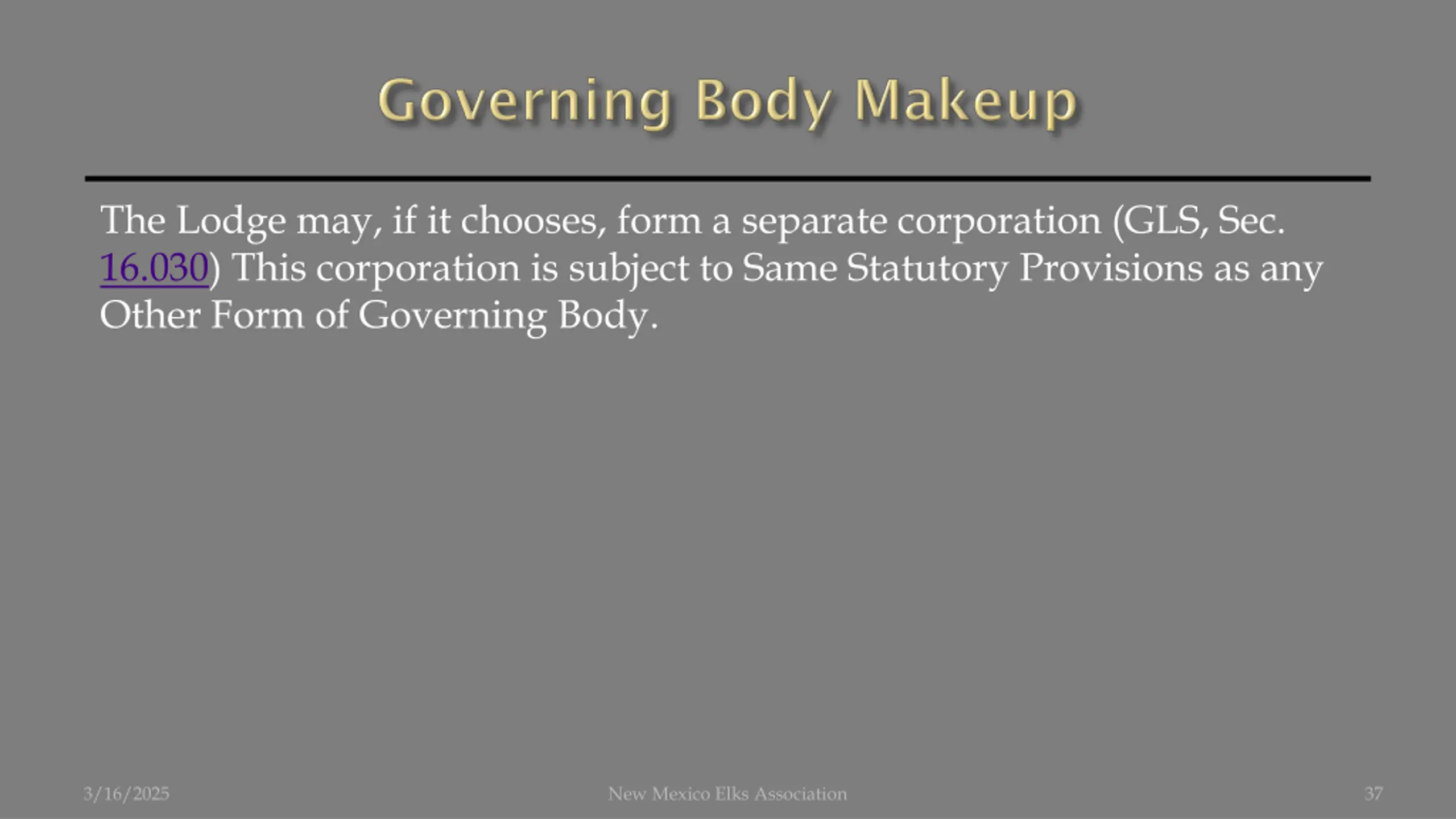 The Lodge may, if it chooses, form a separate corporation (GLS, Sec. 16.030) This corporation is subject to Same Statutory Provisions as any Other Form of Governing Body. 3/16/2025 New Mexico Elks Association 37