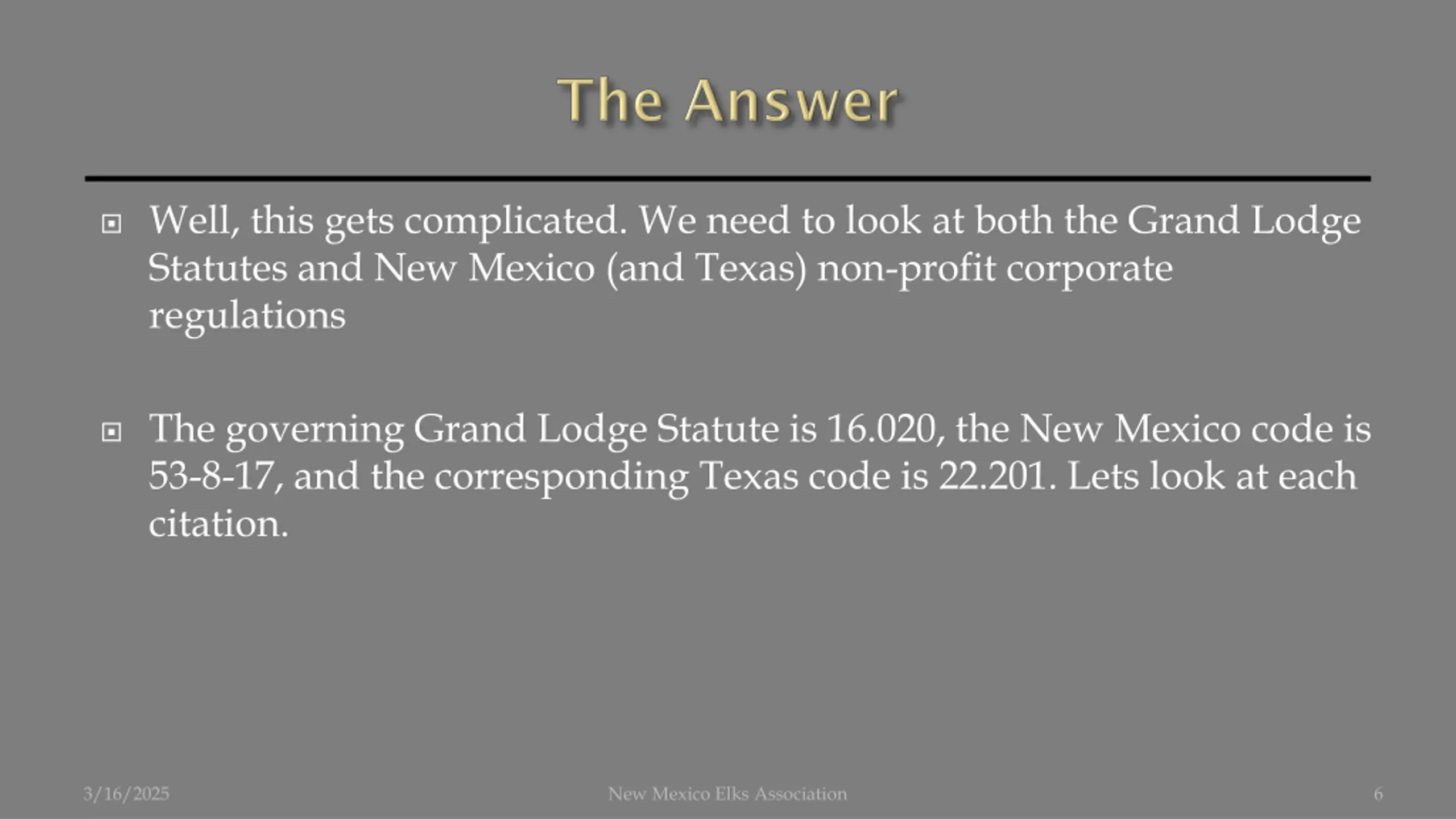 Well, this gets complicated. We need to look at both the Grand Lodge Statutes and New Mexico (and Texas) non-profit corporate regulations The governing Grand Lodge Statute is 16.020, the New Mexico code is 53-8-17, and the corresponding Texas code is 22.201. Lets look at each citation. 3/16/2025 New Mexico Elks Association 6