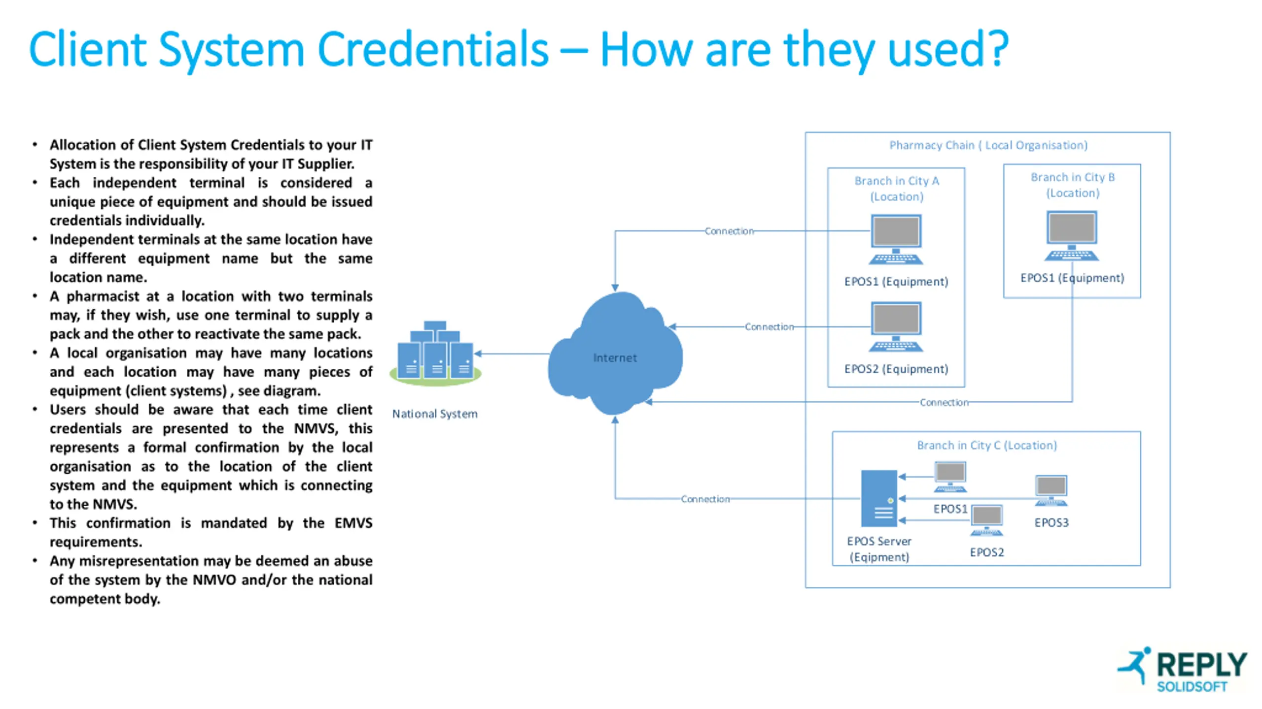 Client System Credentials Client System Credentials How are they used? How are they used? Allocation of Client System Credentials to your IT System is the responsibility of your IT Supplier. Each independent terminal is considered a unique piece of equipment and should be issued credentials individually. Independent terminals at the same location have a different equipment name but the same location name. A pharmacist at a location with two terminals may, if they wish, use one terminal to supply a pack and the other to reactivate the same pack. A local organisation may have many locations and each location may have many pieces of equipment (client systems) , see diagram. Users should be aware that each time client credentials are presented to the NMVS, this represents a formal confirmation by the local organisation as to the location of the client system and the equipment which is connecting to the NMVS. This confirmation is mandated by the EMVS requirements. Any misrepresentation may be deemed an abuse of the system by the NMVO and/or the national competent body. Pharmacy Chain ( Local Organisation) Branch in City B (Location) Branch in City A (Location) Connection EPOS1 (Equipment) EPOS1 (Equipment) Connection Internet EPOS2 (Equipment) Connection National System Branch in City C (Location) Connection EPOS1 EPOS3 EPOS Server (Eqipment) EPOS2