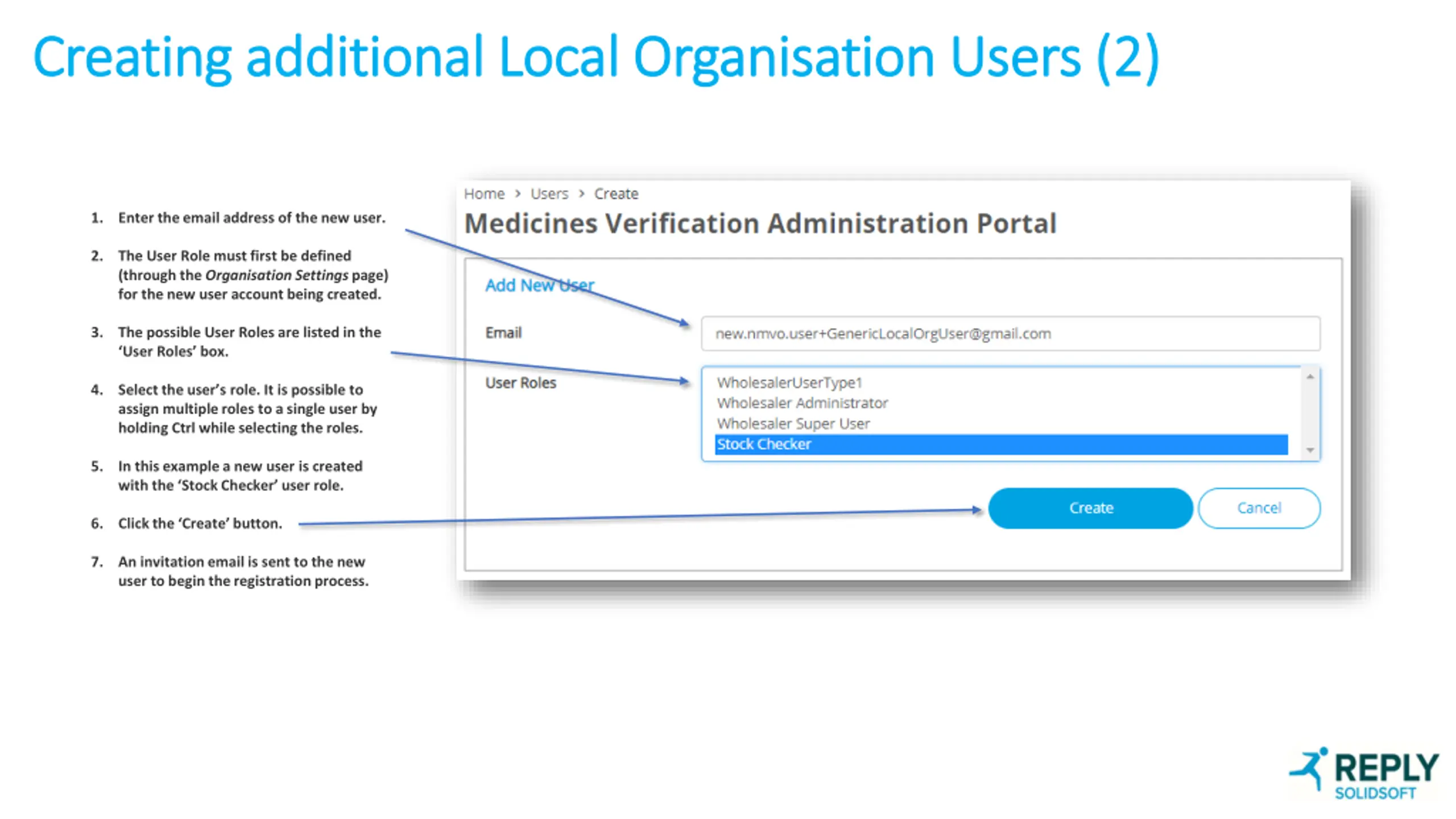 Creating Creating additional additional Local Organisation Users (2) Local Organisation Users (2) 1. Enter the email address of the new user. 2. The User Role must first be defined (through the Organisation Settings page) for the new user account being created. 3. The possible User Roles are listed in the User Roles box. 4. Select the user s role. It is possible to assign multiple roles to a single user by holding Ctrl while selecting the roles. 5. In this example a new user is created with the Stock Checker user role. 6. Click the Create button. 7. An invitation email is sent to the new user to begin the registration process.