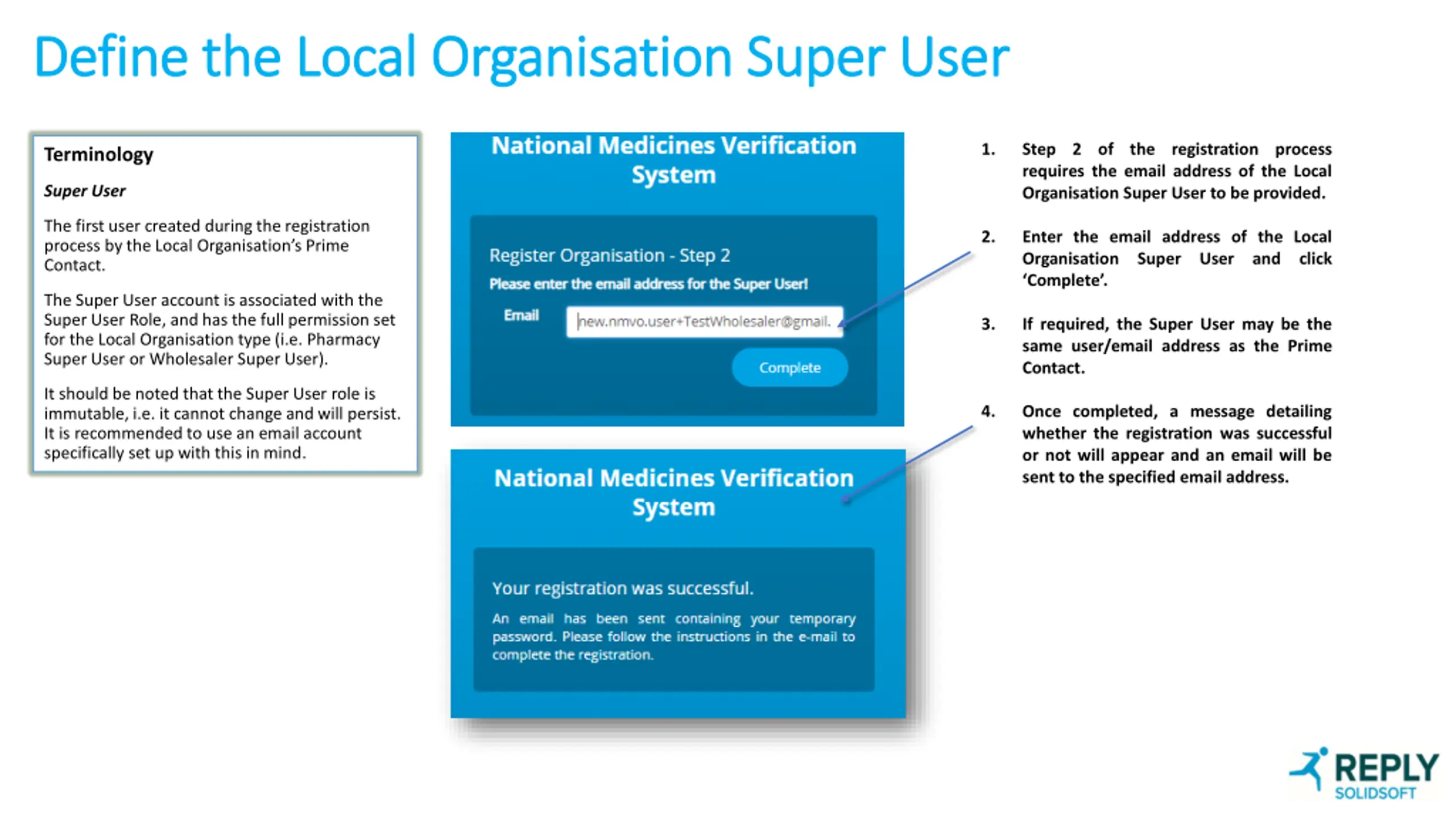 Define the Define the Local Local Organisation Super User Organisation Super User 1. Step 2 of the registration process requires the email address of the Local Organisation Super User to be provided. Terminology Super User The first user created during the registration process by the Local Organisation s Prime Contact. 2. Enter the email address of the Local Organisation Super User and click Complete . The Super User account is associated with the Super User Role, and has the full permission set for the Local Organisation type (i.e. Pharmacy Super User or Wholesaler Super User). 3. If required, the Super User may be the same user/email address as the Prime Contact. It should be noted that the Super User role is immutable, i.e. it cannot change and will persist. It is recommended to use an email account specifically set up with this in mind. 4. Once completed, a message detailing whether the registration was successful or not will appear and an email will be sent to the specified email address.