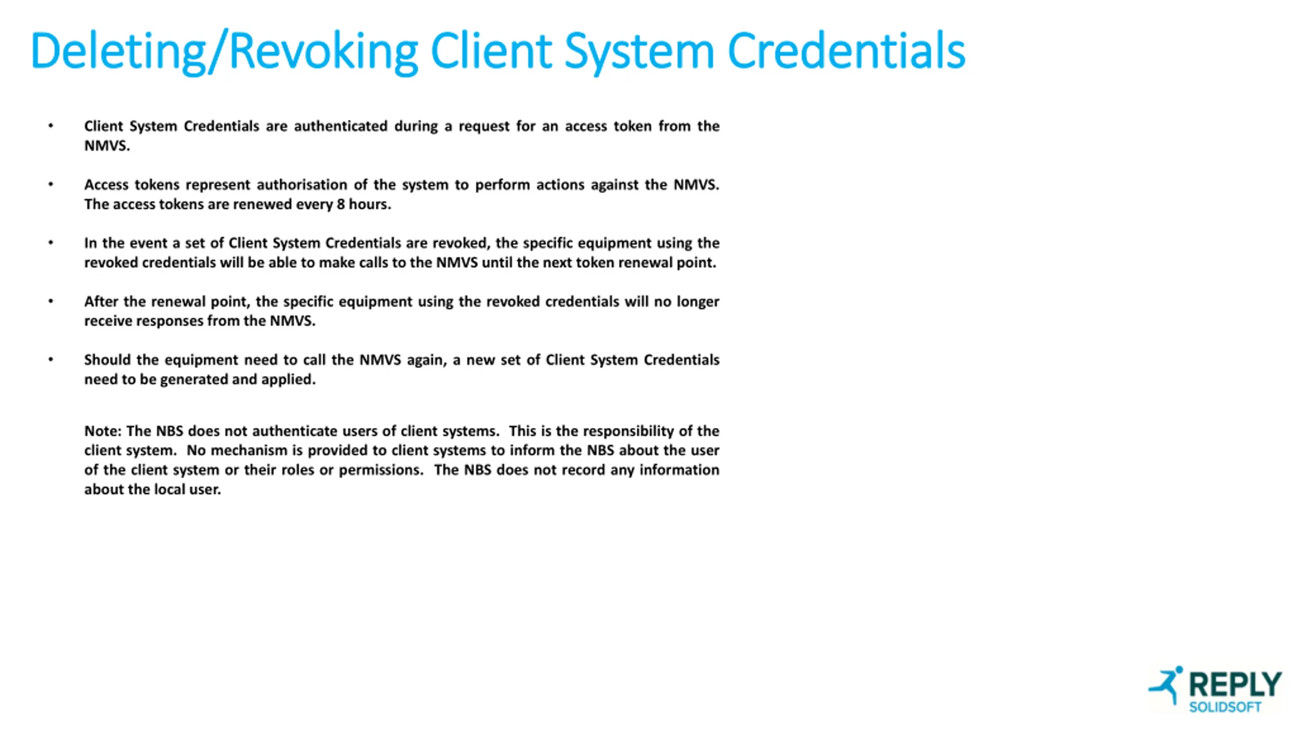 Deleting/Revoking Client System Credentials Deleting/Revoking Client System Credentials Client System Credentials are authenticated during a request for an access token from the NMVS. Access tokens represent authorisation of the system to perform actions against the NMVS. The access tokens are renewed every 8 hours. In the event a set of Client System Credentials are revoked, the specific equipment using the revoked credentials will be able to make calls to the NMVS until the next token renewal point. After the renewal point, the specific equipment using the revoked credentials will no longer receive responses from the NMVS. Should the equipment need to call the NMVS again, a new set of Client System Credentials need to be generated and applied. Note: The NBS does not authenticate users of client systems. This is the responsibility of the client system. No mechanism is provided to client systems to inform the NBS about the user of the client system or their roles or permissions. The NBS does not record any information about the local user.