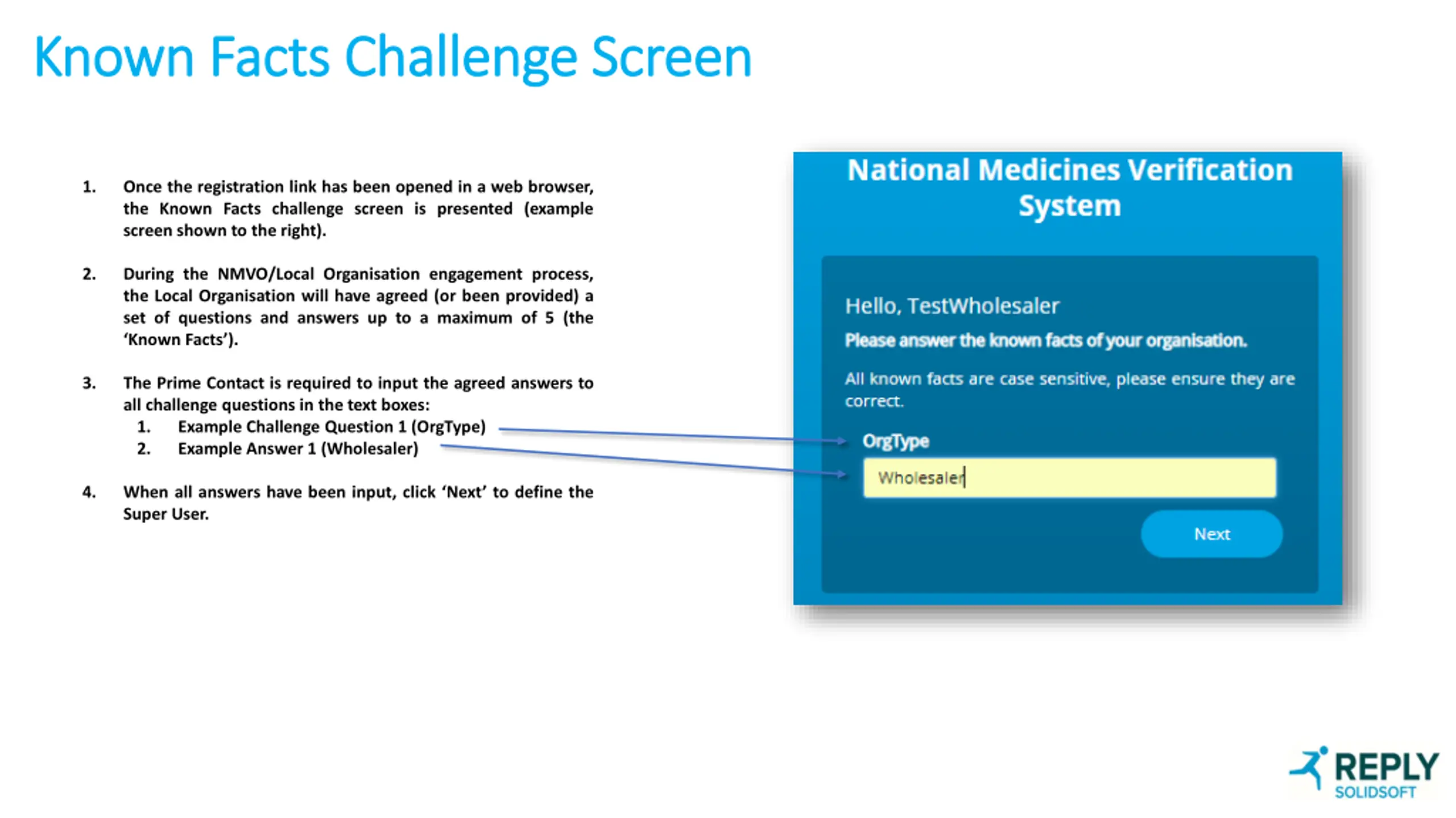 Known Known Facts Challenge Screen Facts Challenge Screen 1. Once the registration link has been opened in a web browser, the Known Facts challenge screen is presented (example screen shown to the right). 2. During the NMVO/Local Organisation engagement process, the Local Organisation will have agreed (or been provided) a set of questions and answers up to a maximum of 5 (the KnownFacts ). 3. The Prime Contact is required to input the agreed answers to all challenge questions in the text boxes: 1. Example Challenge Question 1 (OrgType) 2. Example Answer 1 (Wholesaler) 4. When all answers have been input, click Next to define the Super User.