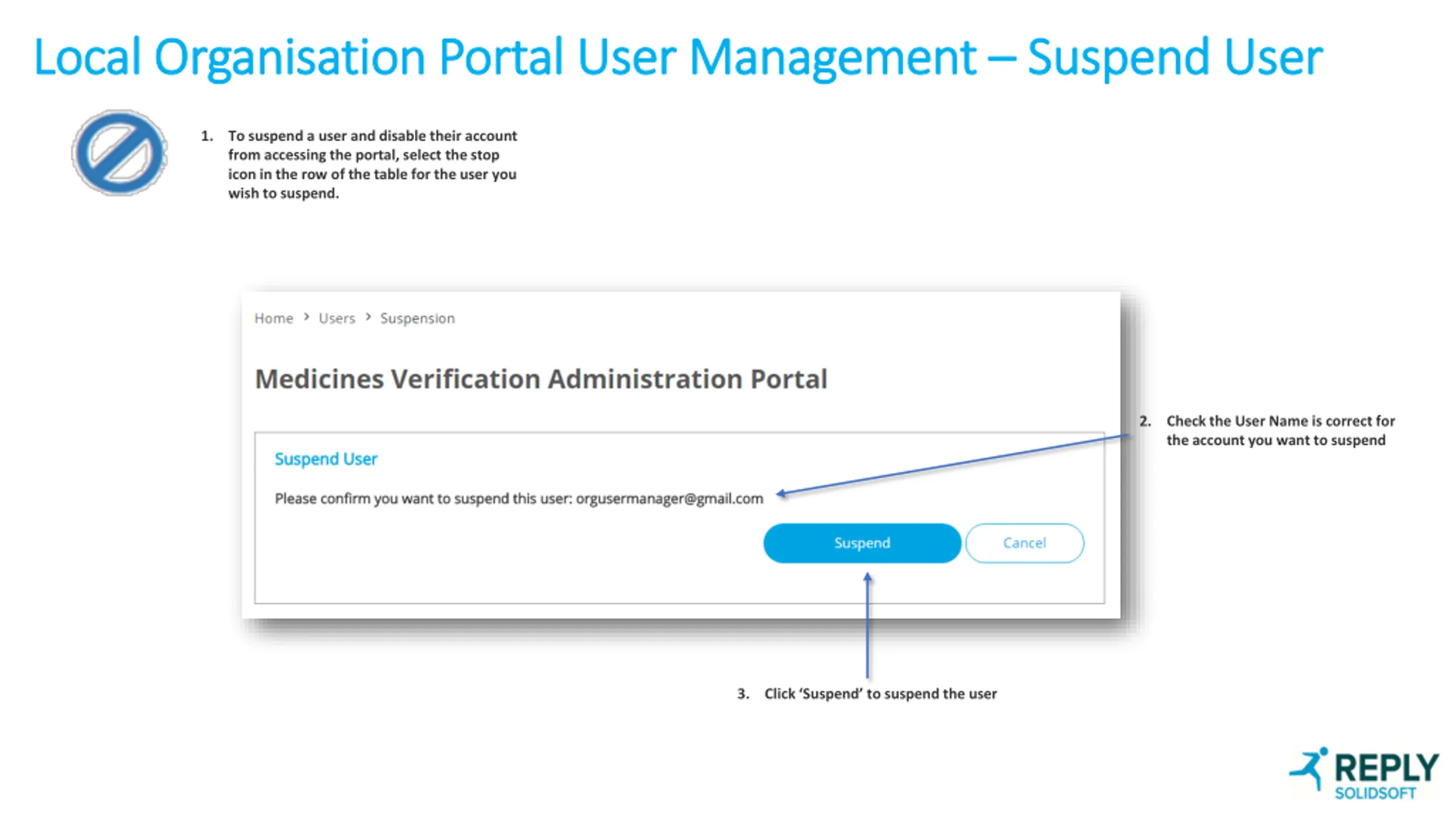 Local Local Organisation Organisation Portal Portal User User M Management anagement Suspend User Suspend User 1. To suspend a user and disable their account from accessing the portal, select the stop icon in the row of the table for the user you wish to suspend. 2. Check the User Name is correct for the account you want to suspend 3. Click Suspend to suspend the user