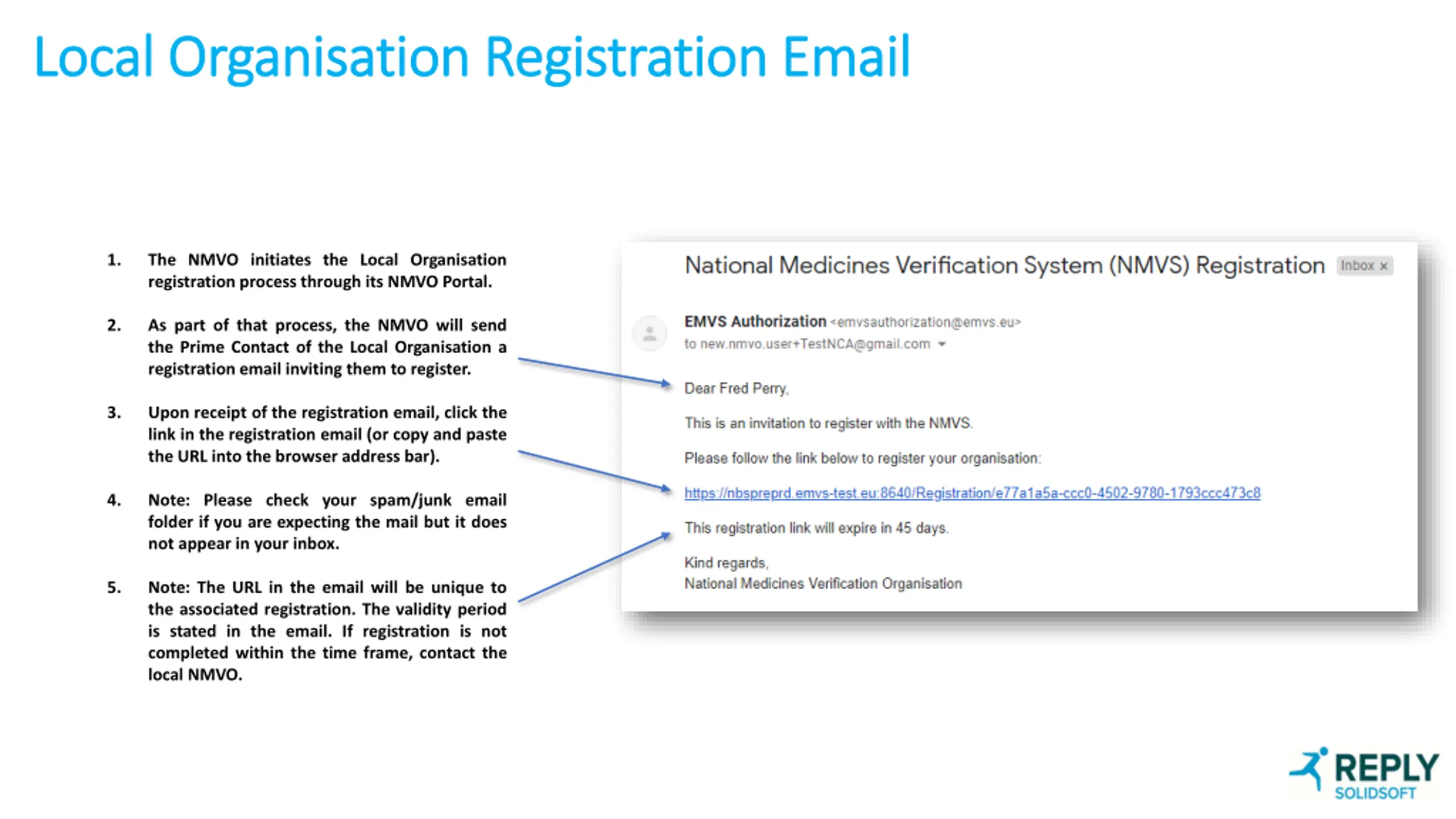 Local Organisation Local Organisation Registration Email Registration Email 1. The NMVO initiates the Local Organisation registration process through its NMVO Portal. 2. As part of that process, the NMVO will send the Prime Contact of the Local Organisation a registration email inviting them to register. 3. Upon receipt of the registration email, click the link in the registration email (or copy and paste the URL into the browser address bar). 4. Note: Please check your spam/junk email folder if you are expecting the mail but it does not appear in your inbox. 5. Note: The URL in the email will be unique to the associated registration. The validity period is stated in the email. If registration is not completed within the time frame, contact the local NMVO.