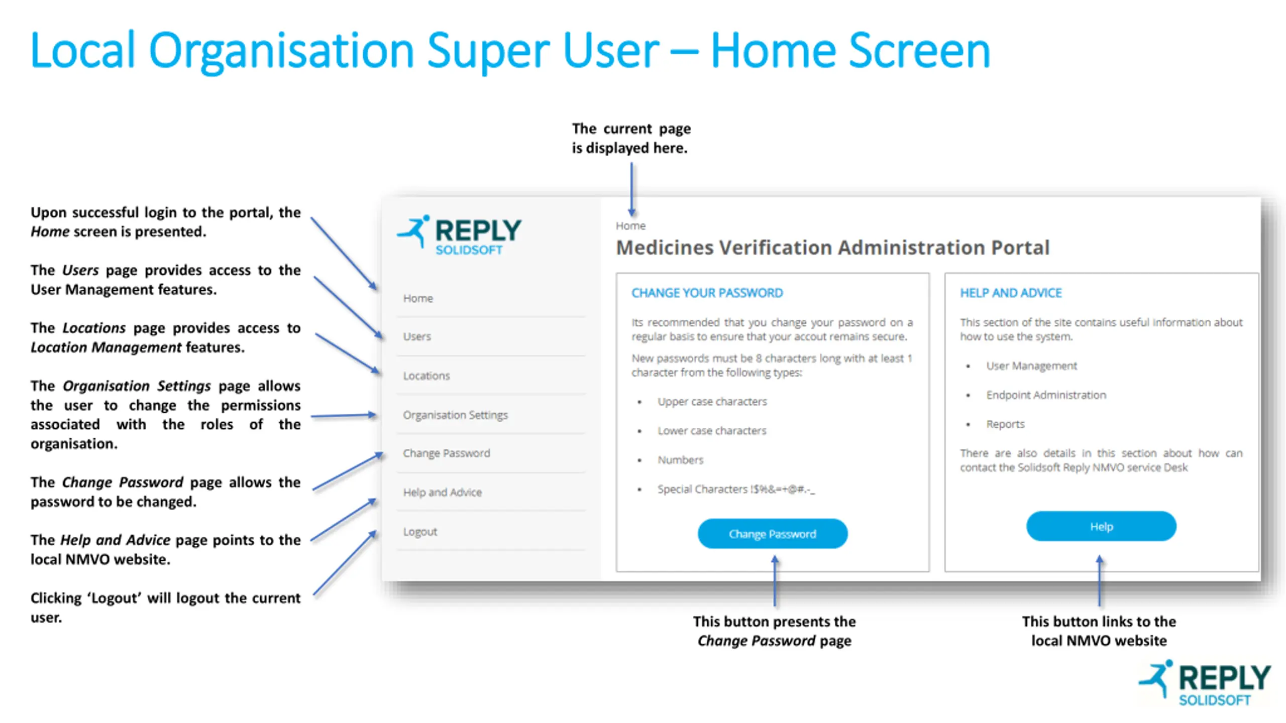 Local Organisation Local Organisation Super User Super User Home Screen Home Screen The current page is displayed here. Upon successful login to the portal, the Home screen is presented. The Users page provides access to the User Management features. The Locations page provides access to Location Management features. The Organisation Settings page allows the user to change the permissions associated with the roles of the organisation. The Change Password page allows the password to be changed. The Help and Advice page points to the local NMVO website. Clicking Logout will logout the current user. This button presents the Change Password page This button links to the local NMVO website