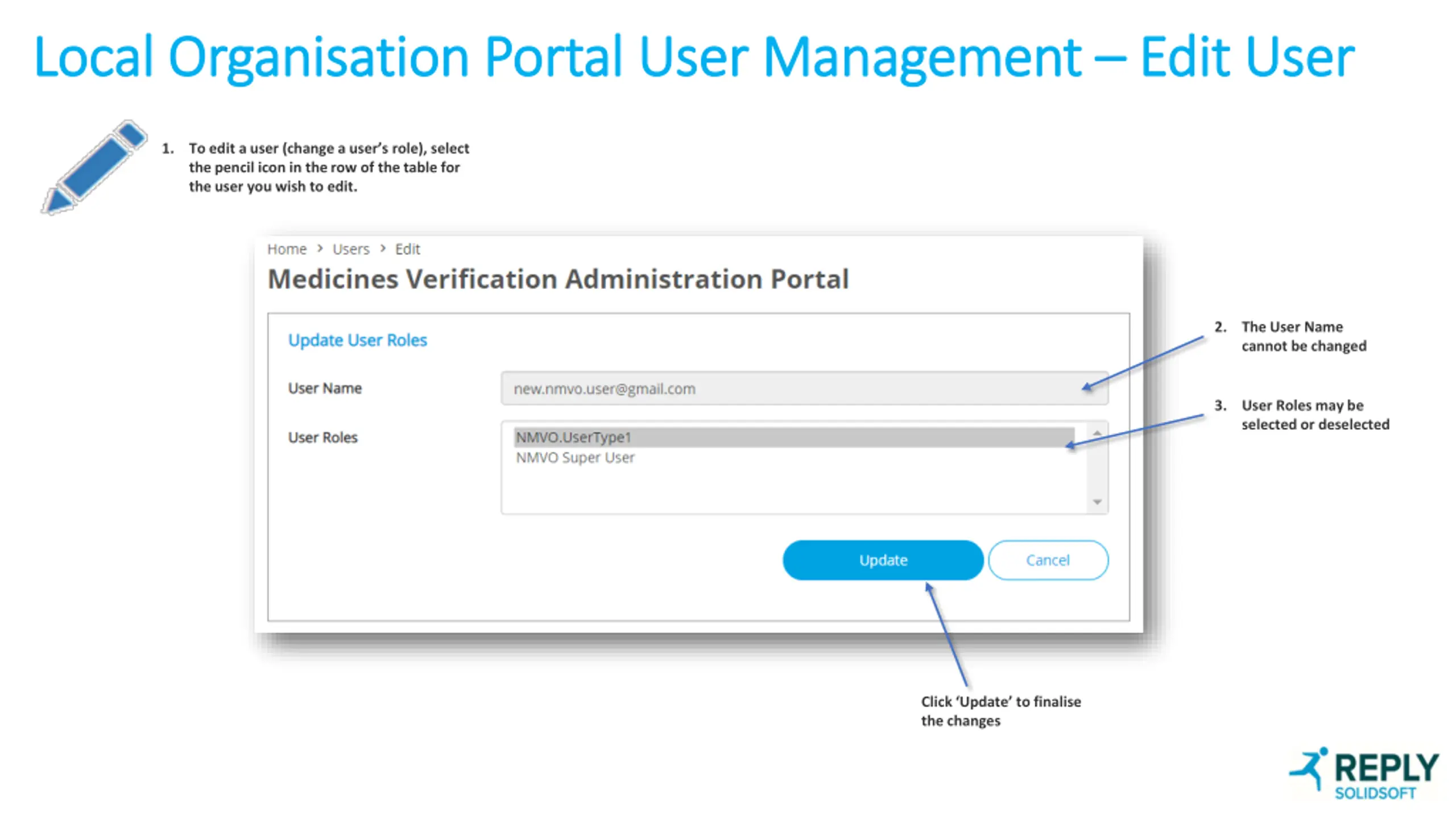 Local Organisation Portal Local Organisation Portal User Management User Management Edit User Edit User 1. To edit a user (change a user s role), select the pencil icon in the row of the table for the user you wish to edit. 2. The User Name cannot be changed 3. User Roles may be selected or deselected Click Update to finalise the changes