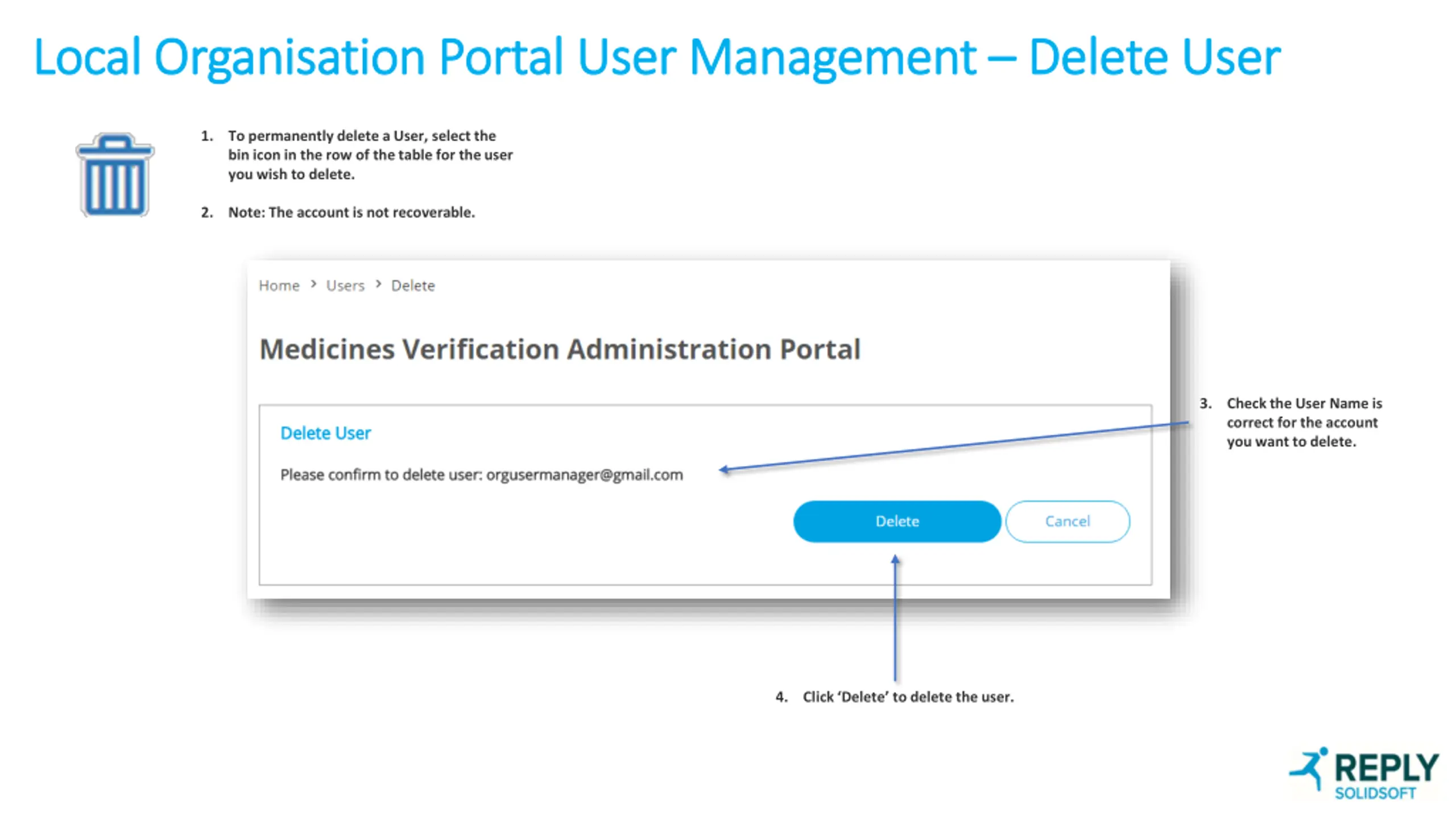 Local Organisation Portal Local Organisation Portal User Management User Management Delete User Delete User 1. To permanently delete a User, select the bin icon in the row of the table for the user you wish to delete. 2. Note: The account is not recoverable. 3. Check the User Name is correct for the account you want to delete. 4. Click Delete to delete the user.
