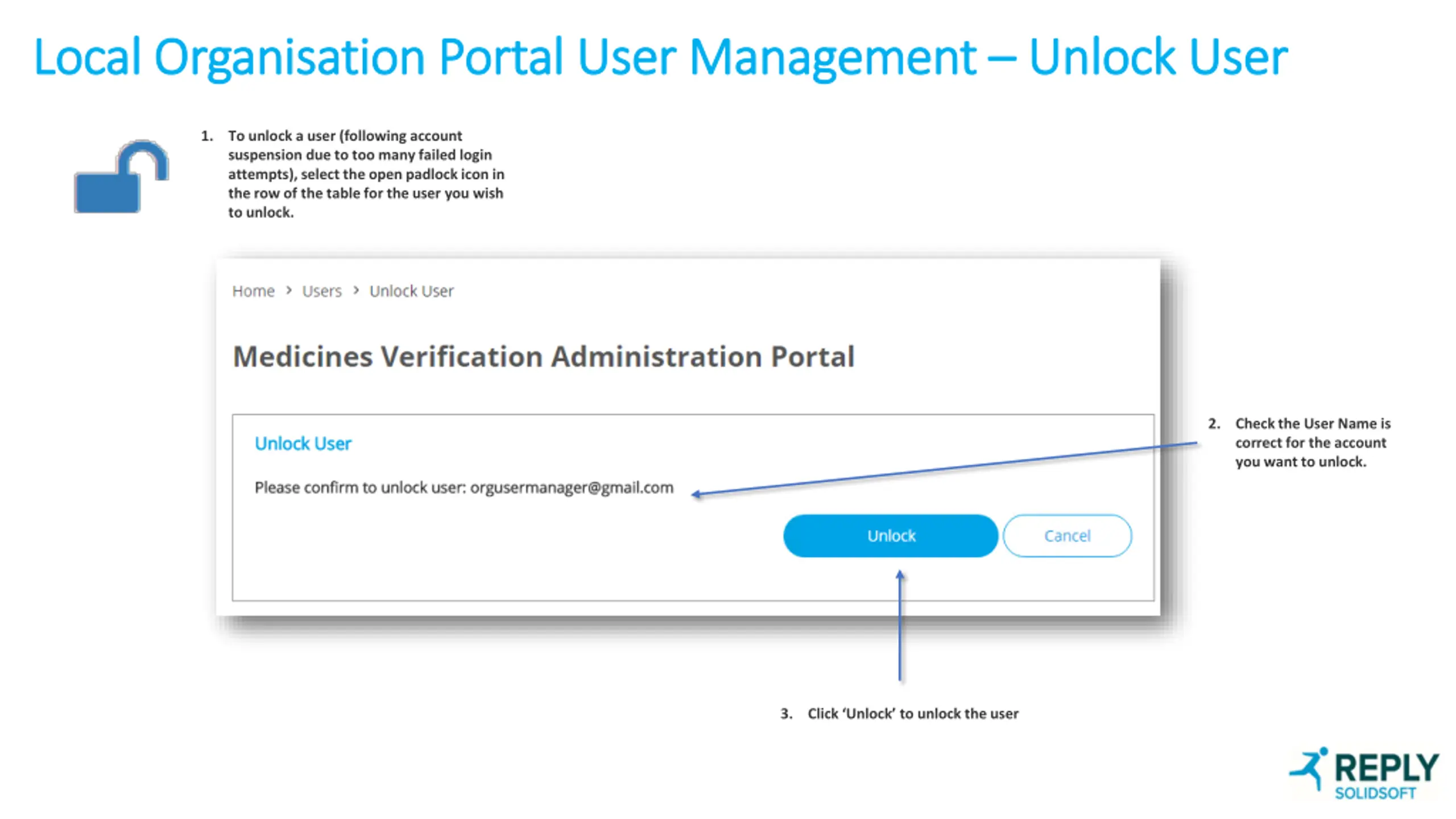 Local Organisation Portal Local Organisation Portal User Management User Management Unlock User Unlock User 1. To unlock a user (following account suspension due to too many failed login attempts), select the open padlock icon in the row of the table for the user you wish to unlock. 2. Check the User Name is correct for the account you want to unlock. 3. Click Unlock to unlock the user