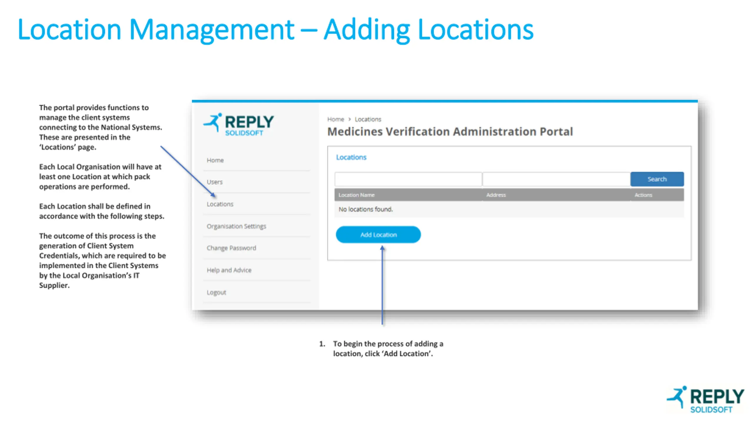 Location Location Management Management Adding Locations Adding Locations The portal provides functions to manage the client systems connecting to the National Systems. These are presented in the Locations page. Each Local Organisation will have at least one Location at which pack operations are performed. Each Location shall be defined in accordance with the following steps. The outcome of this process is the generation of Client System Credentials, which are required to be implemented in the Client Systems by the Local Organisation s IT Supplier. 1. To begin the process of adding a location, click Add Location .