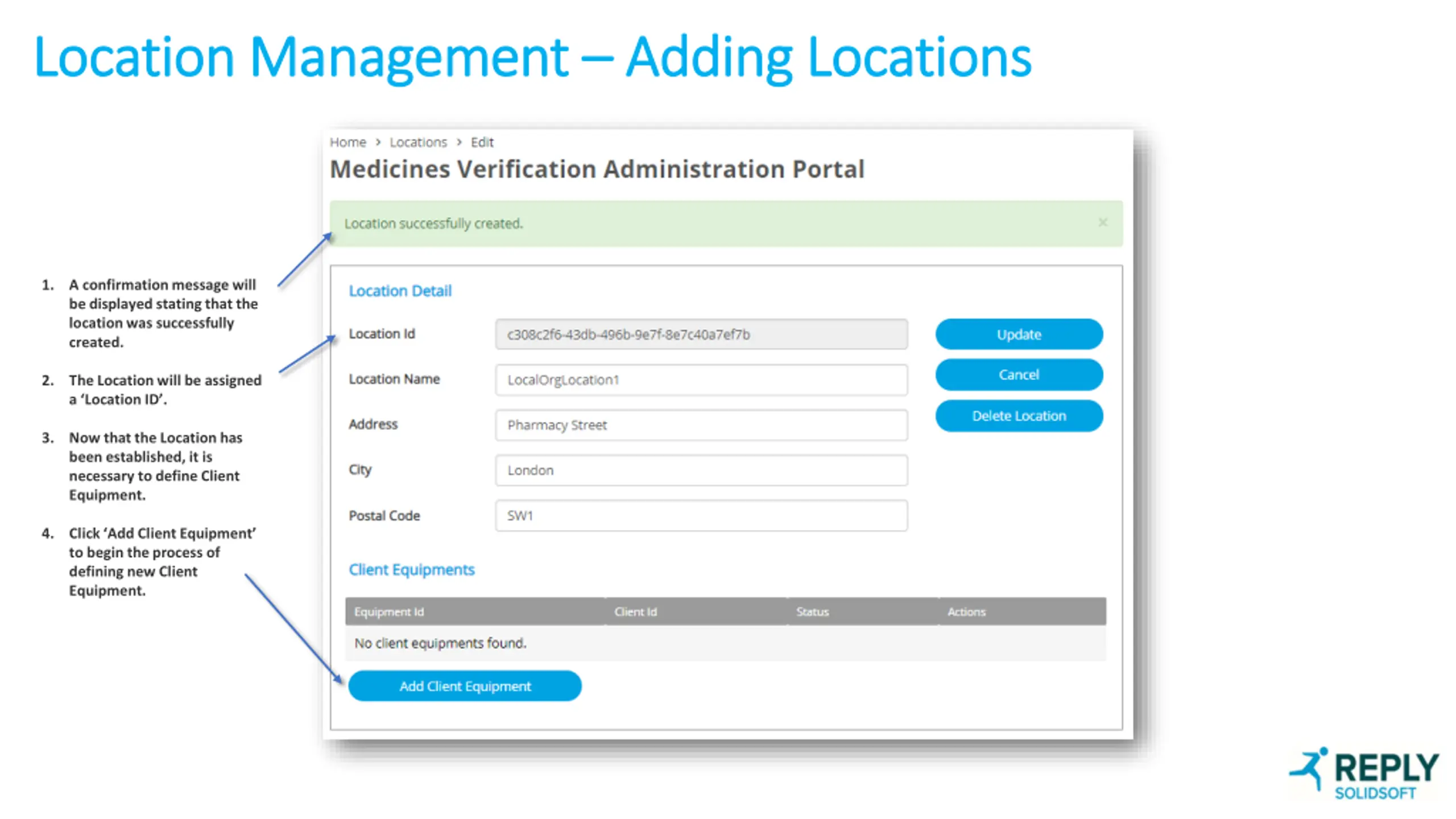 Location Management Location Management Adding Locations Adding Locations 1. A confirmation message will be displayed stating that the location was successfully created. 2. The Location will be assigned a Location ID . 3. Now that the Location has been established, it is necessary to define Client Equipment. 4. Click Add Client Equipment to begin the process of defining new Client Equipment.