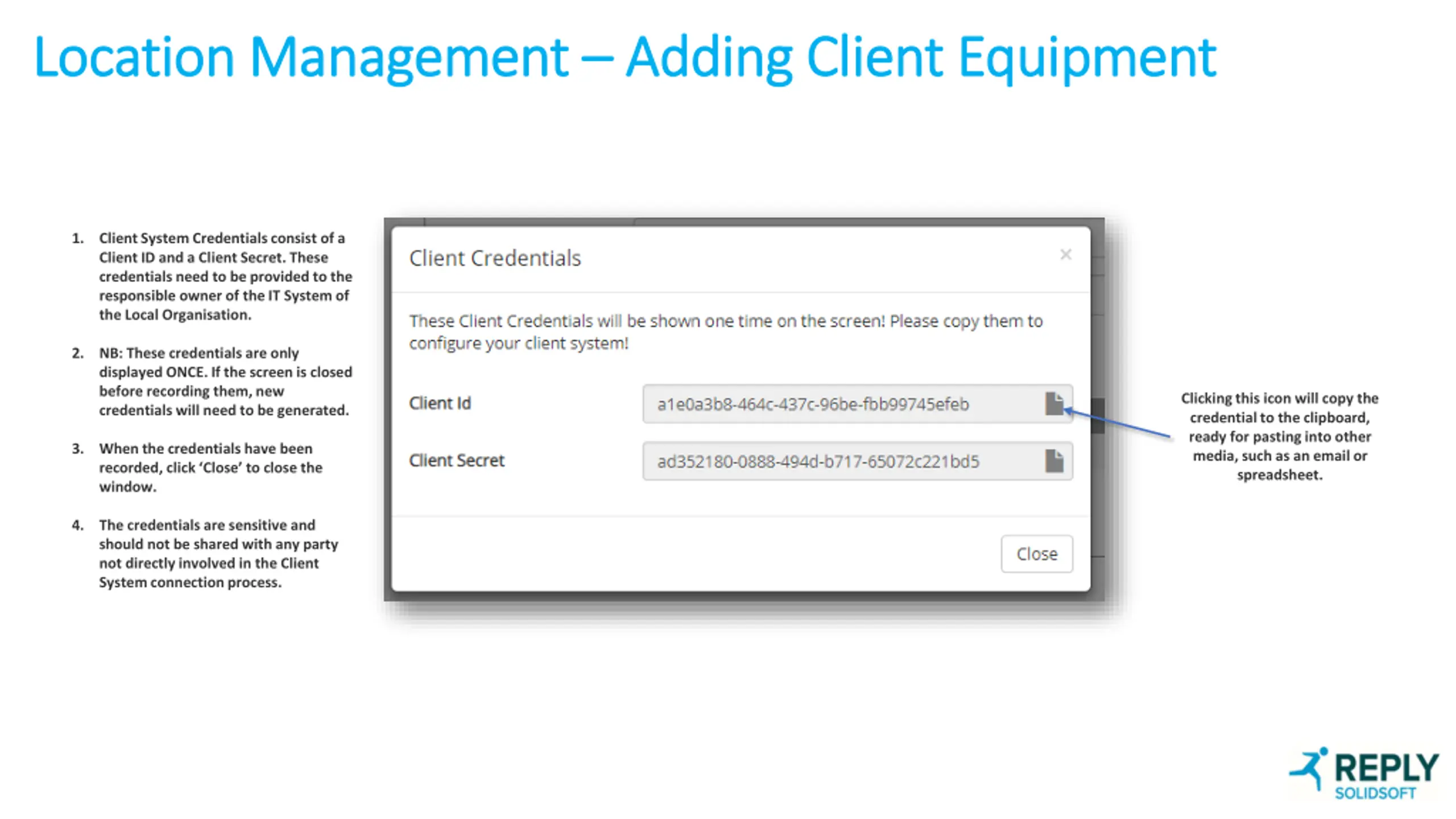 Location Management Location Management Adding Client Equipment Adding Client Equipment 1. Client System Credentials consist of a Client ID and a Client Secret. These credentials need to be provided to the responsible owner of the IT System of the Local Organisation. 2. NB: These credentials are only displayed ONCE. If the screen is closed before recording them, new credentials will need to be generated. Clicking this icon will copy the credential to the clipboard, ready for pasting into other media, such as an email or spreadsheet. 3. When the credentials have been recorded, click Close to close the window. 4. The credentials are sensitive and should not be shared with any party not directly involved in the Client System connection process.