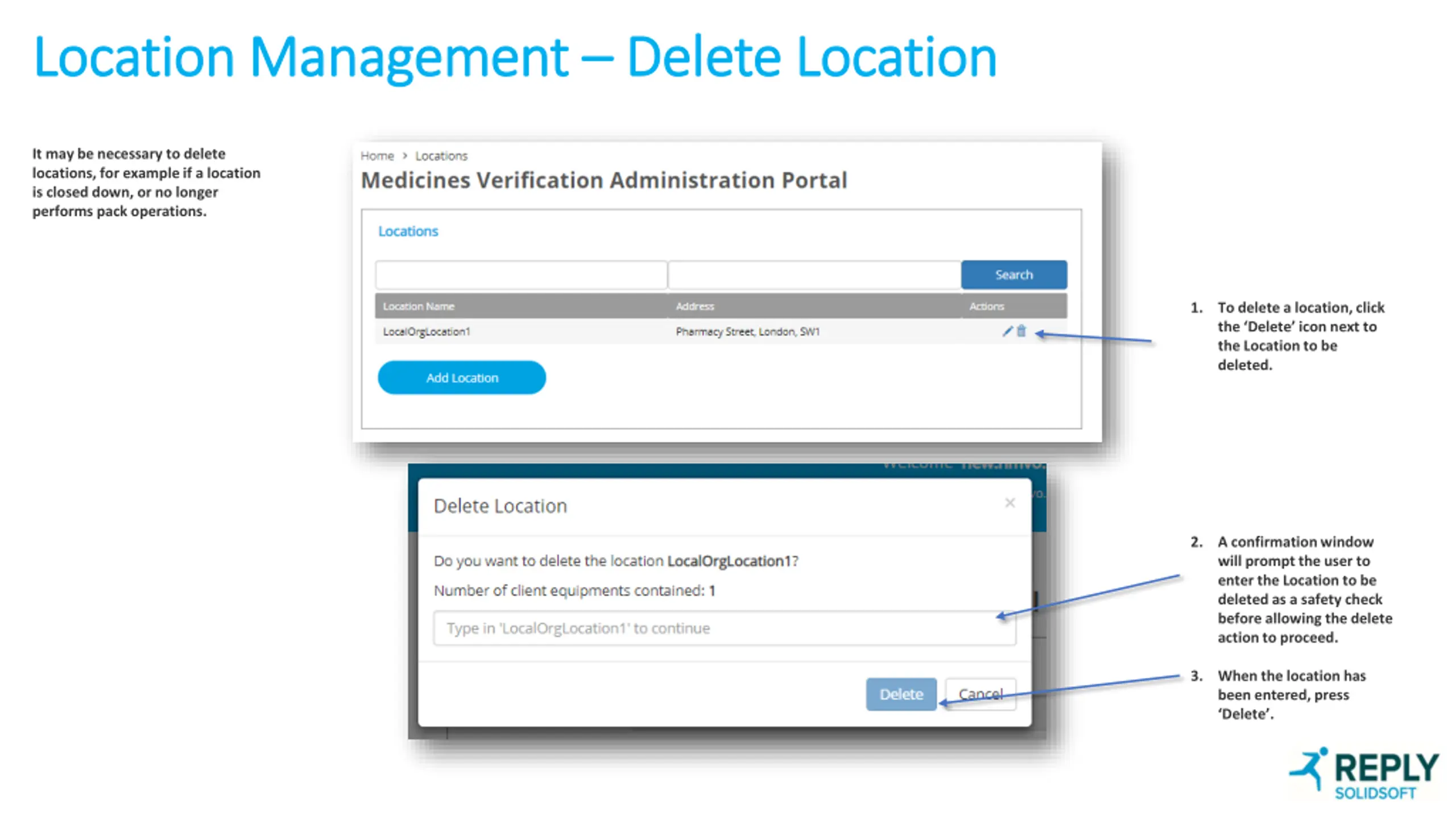 Location Management Location Management Delete Delete Location Location It may be necessary to delete locations, for example if a location is closed down, or no longer performs pack operations. 1. To delete a location, click the Delete icon next to the Location to be deleted. 2. A confirmation window will prompt the user to enter the Location to be deleted as a safety check before allowing the delete action to proceed. 3. When the location has been entered, press Delete .