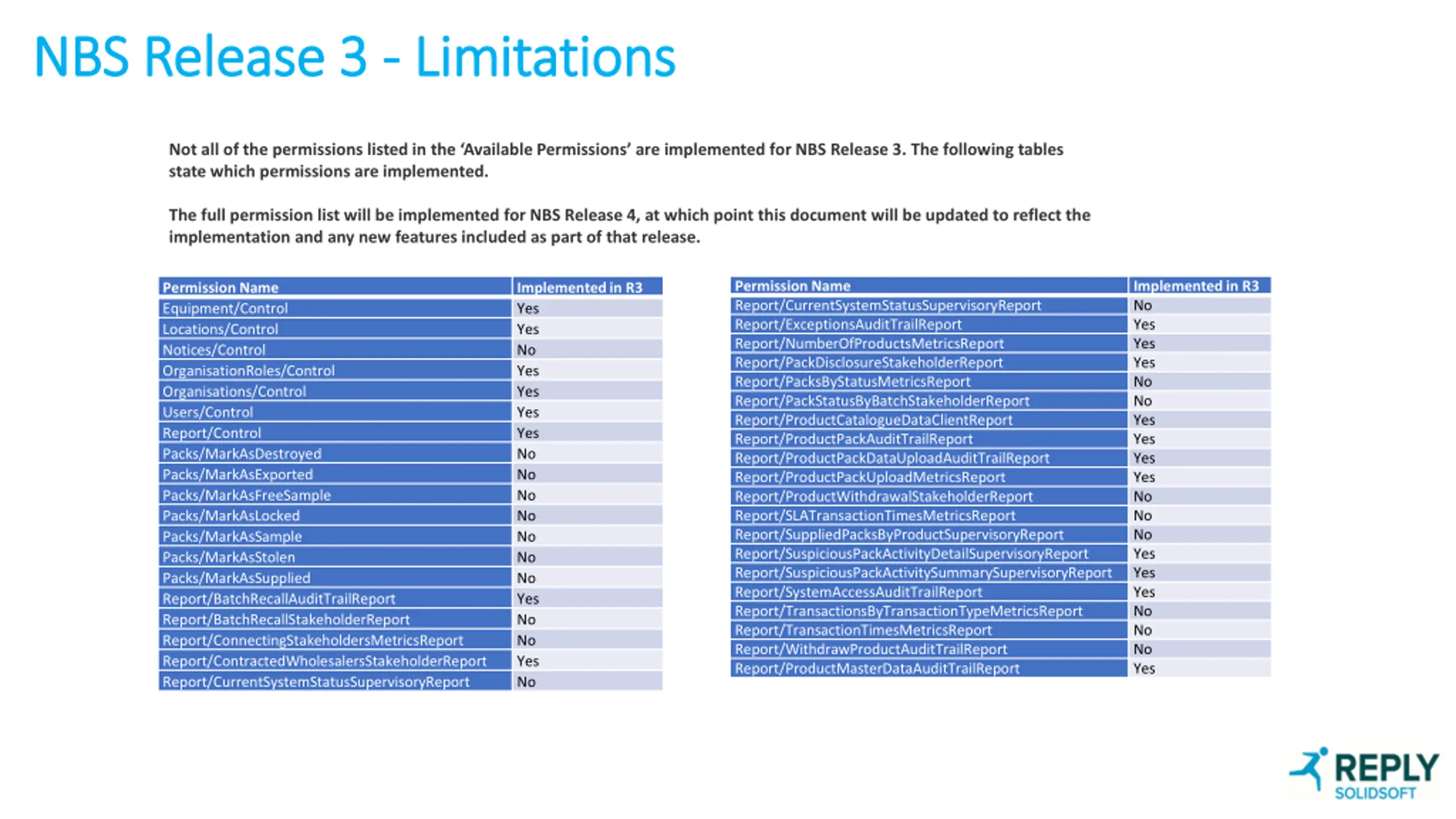 NBS Release 3 NBS Release 3 - - Limitations Limitations Not all of the permissions listed in the Available Permissions are implemented for NBS Release 3. The following tables state which permissions are implemented. The full permission list will be implemented for NBS Release 4, at which point this document will be updated to reflect the implementation and any new features included as part of that release. Permission Name Report/CurrentSystemStatusSupervisoryReport Report/ExceptionsAuditTrailReport Report/NumberOfProductsMetricsReport Report/PackDisclosureStakeholderReport Report/PacksByStatusMetricsReport Report/PackStatusByBatchStakeholderReport Report/ProductCatalogueDataClientReport Report/ProductPackAuditTrailReport Report/ProductPackDataUploadAuditTrailReport Report/ProductPackUploadMetricsReport Report/ProductWithdrawalStakeholderReport Report/SLATransactionTimesMetricsReport Report/SuppliedPacksByProductSupervisoryReport Report/SuspiciousPackActivityDetailSupervisoryReport Report/SuspiciousPackActivitySummarySupervisoryReport Report/SystemAccessAuditTrailReport Report/TransactionsByTransactionTypeMetricsReport Report/TransactionTimesMetricsReport Report/WithdrawProductAuditTrailReport Report/ProductMasterDataAuditTrailReport Implemented in R3 No Yes Yes Yes No No Yes Yes Yes Yes No No No Yes Yes Yes No No No Yes Permission Name Equipment/Control Locations/Control Notices/Control OrganisationRoles/Control Organisations/Control Users/Control Report/Control Packs/MarkAsDestroyed Packs/MarkAsExported Packs/MarkAsFreeSample Packs/MarkAsLocked Packs/MarkAsSample Packs/MarkAsStolen Packs/MarkAsSupplied Report/BatchRecallAuditTrailReport Report/BatchRecallStakeholderReport Report/ConnectingStakeholdersMetricsReport Report/ContractedWholesalersStakeholderReport Report/CurrentSystemStatusSupervisoryReport Implemented in R3 Yes Yes No Yes Yes Yes Yes No No No No No No No Yes No No Yes No