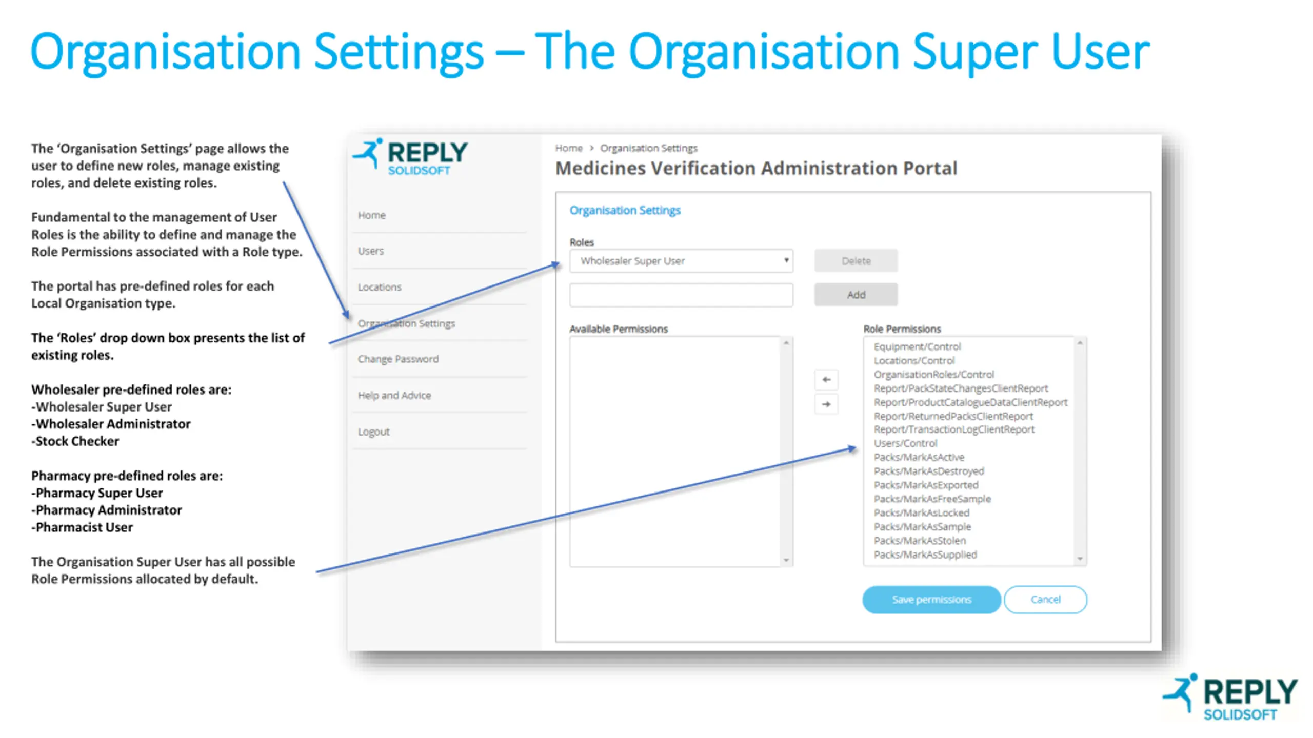 Organisation Settings Organisation Settings The Organisation Super User The Organisation Super User The Organisation Settings page allows the user to define new roles, manage existing roles, and delete existing roles. Fundamental to the management of User Roles is the ability to define and manage the Role Permissions associated with a Role type. The portal has pre-defined roles for each Local Organisation type. The Roles drop down box presents the list of existing roles. Wholesaler pre-defined roles are: -Wholesaler Super User -Wholesaler Administrator -Stock Checker Pharmacy pre-defined roles are: -Pharmacy Super User -Pharmacy Administrator -Pharmacist User The Organisation Super User has all possible Role Permissions allocated by default.