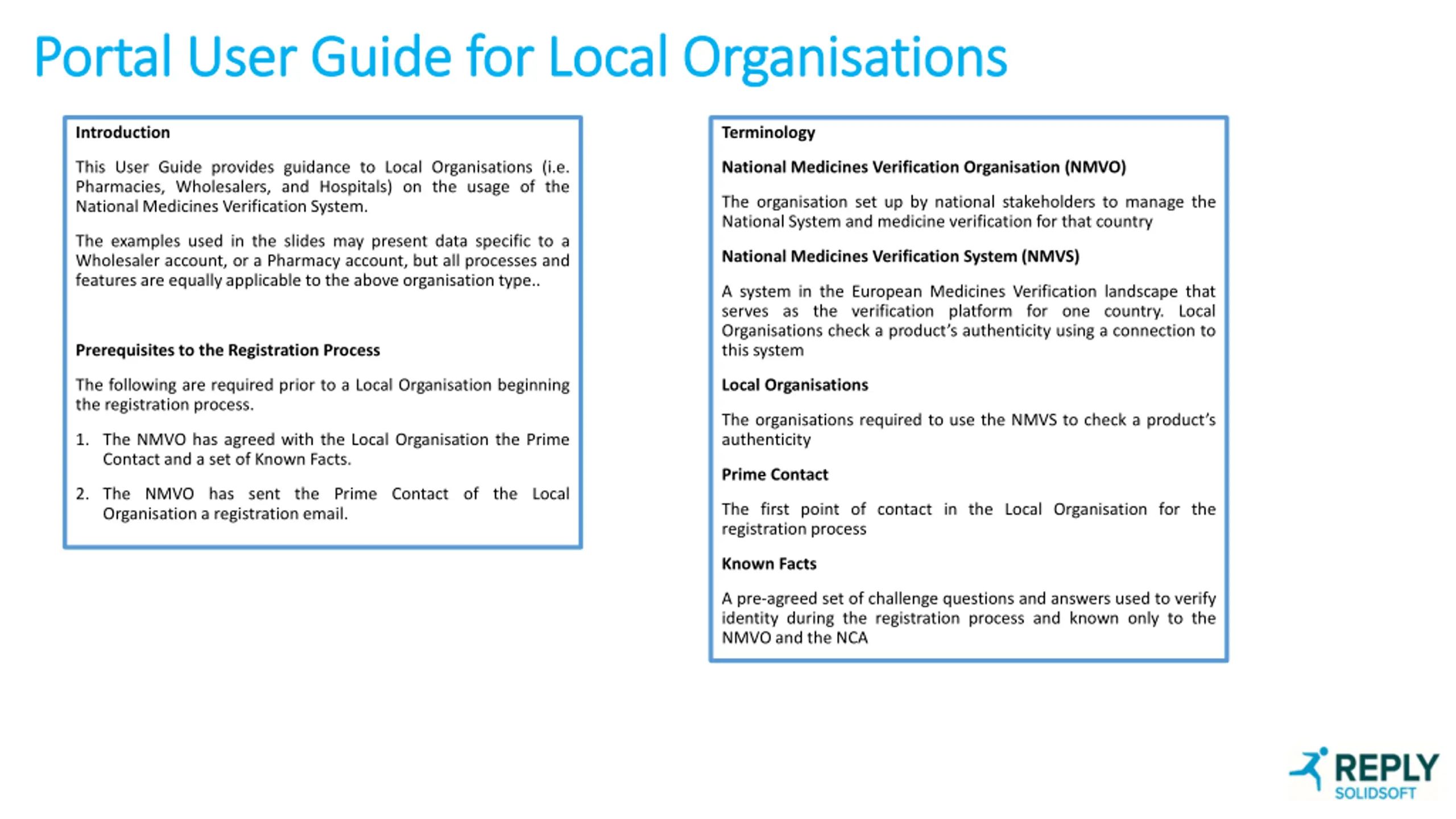 Portal User Guide Portal User Guide for Local Organisations for Local Organisations Introduction Terminology This User Guide provides guidance to Local Organisations (i.e. Pharmacies, Wholesalers, and Hospitals) on the usage of the National Medicines Verification System. National Medicines Verification Organisation (NMVO) The organisation set up by national stakeholders to manage the National System and medicine verification for that country The examples used in the slides may present data specific to a Wholesaler account, or a Pharmacy account, but all processes and features are equally applicable to the above organisation type.. National Medicines Verification System (NMVS) A system in the European Medicines Verification landscape that serves as the verification platform for one country. Local Organisations check a product s authenticity using a connection to this system Prerequisites to the Registration Process The following are required prior to a Local Organisation beginning the registration process. Local Organisations The organisations required to use the NMVS to check a product s authenticity 1. The NMVO has agreed with the Local Organisation the Prime Contact and a set of Known Facts. Prime Contact 2. The NMVO has sent the Prime Contact of the Local Organisation a registration email. The first point of contact in the Local Organisation for the registration process Known Facts A pre-agreed set of challenge questions and answers used to verify identity during the registration process and known only to the NMVO and the NCA
