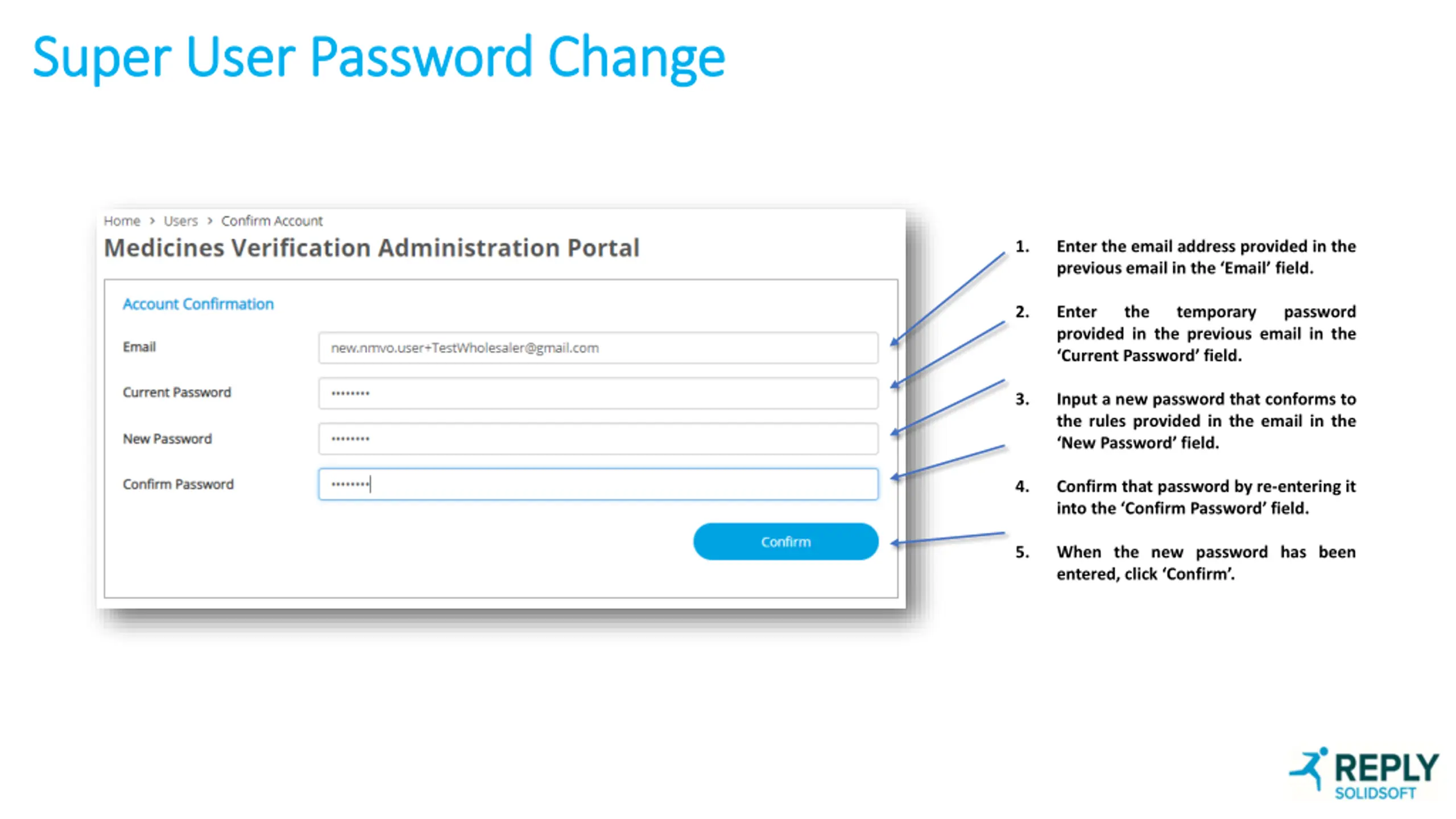 Super User Password Change Super User Password Change 1. Enter the email address provided in the previous email in the Email field. 2. Enter provided in the previous email in the CurrentPassword field. the temporary password 3. Input a new password that conforms to the rules provided in the email in the NewPassword field. 4. Confirm that password by re-entering it into the ConfirmPassword field. 5. When the new password has been entered, click Confirm .