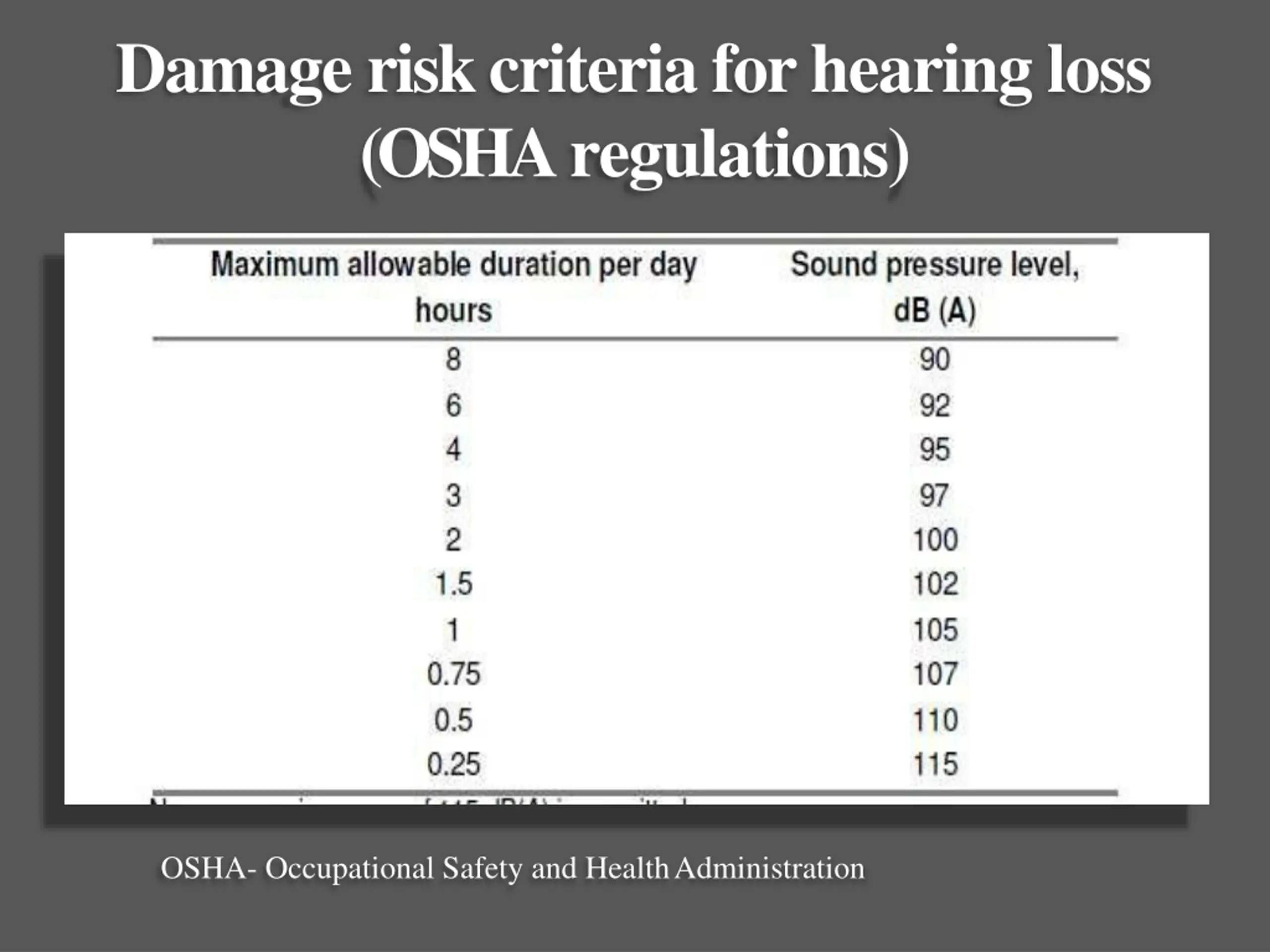 Damage risk criteria for hearing loss (OSHAregulations) OSHA- Occupational Safety and HealthAdministration