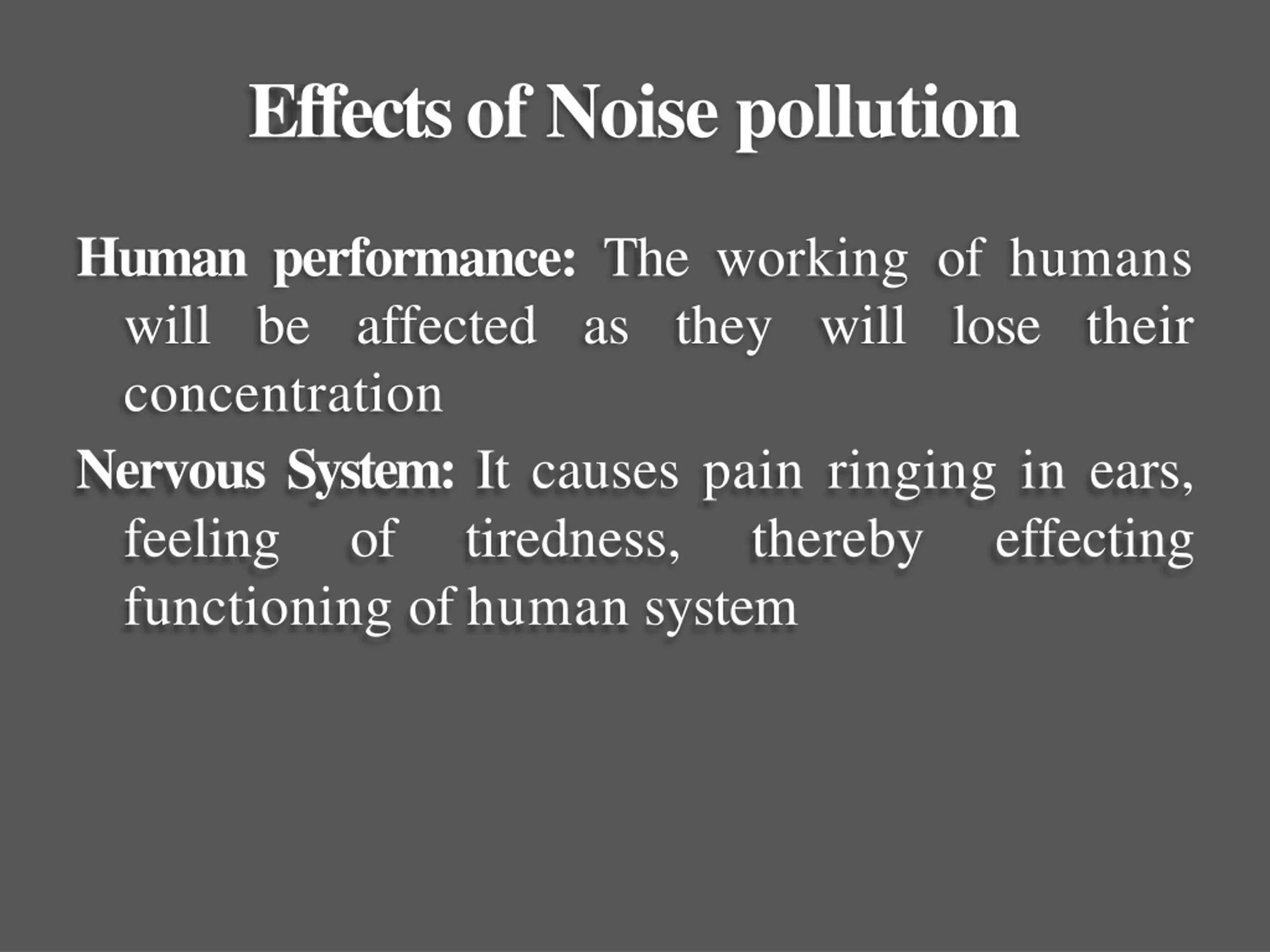 Effects of Noisepollution Human performance: The working of humans will be affected as they will lose their concentration Nervous System: It causes pain ringing in ears, feeling of tiredness, functioning of human system thereby effecting