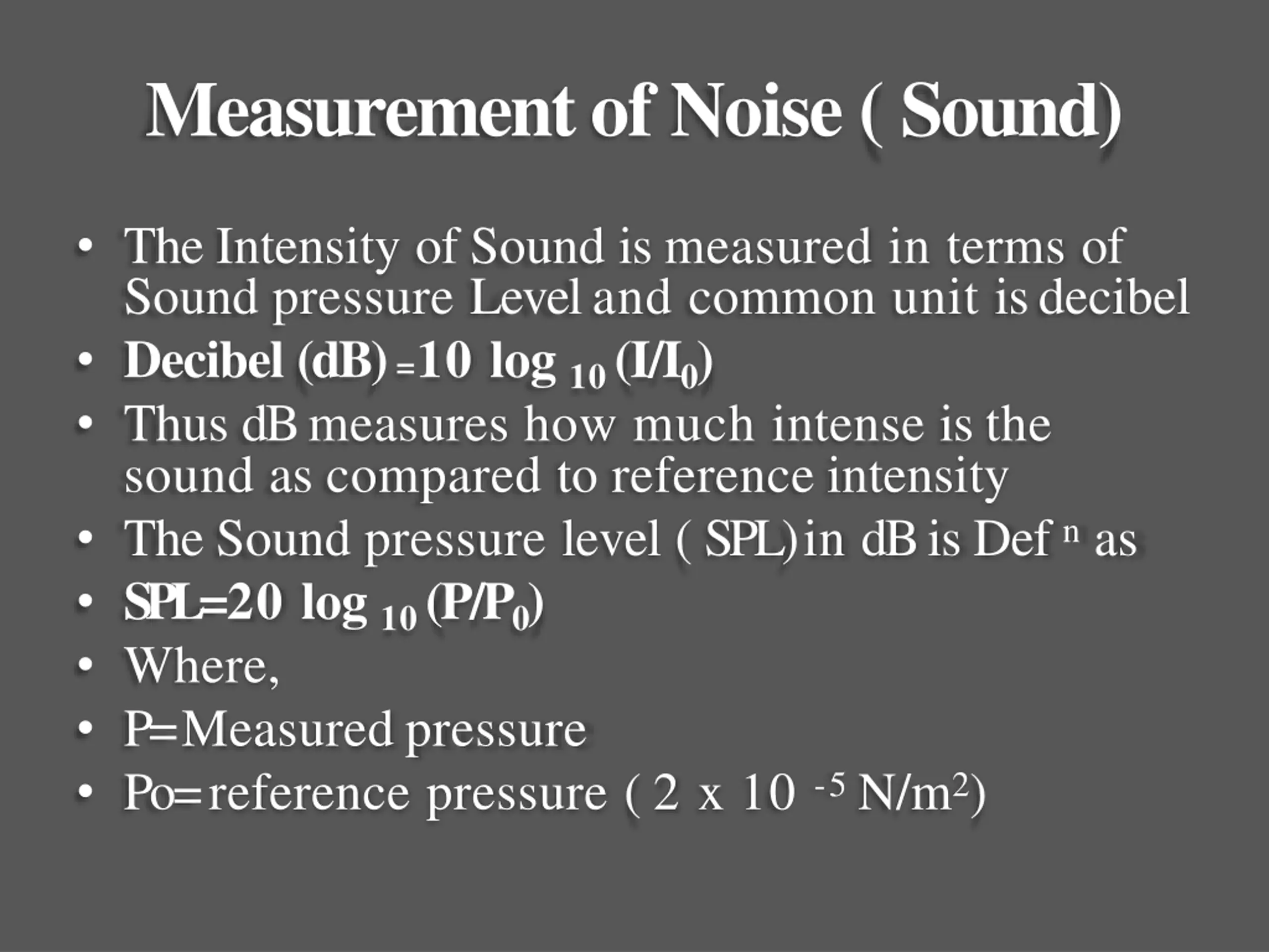 Measurement of Noise ( Sound) The Intensity of Sound is measured in terms of Sound pressure Level and common unit isdecibel Decibel (dB) = 10 log 10(I/I0) Thus dB measures how much intense is the sound as compared to reference intensity The Sound pressure level ( SPL) in dB is Def nas SPL= 20 log 10(P/P0) Where, P= Measured pressure Po= reference pressure ( 2 x 10 -5N/m2)