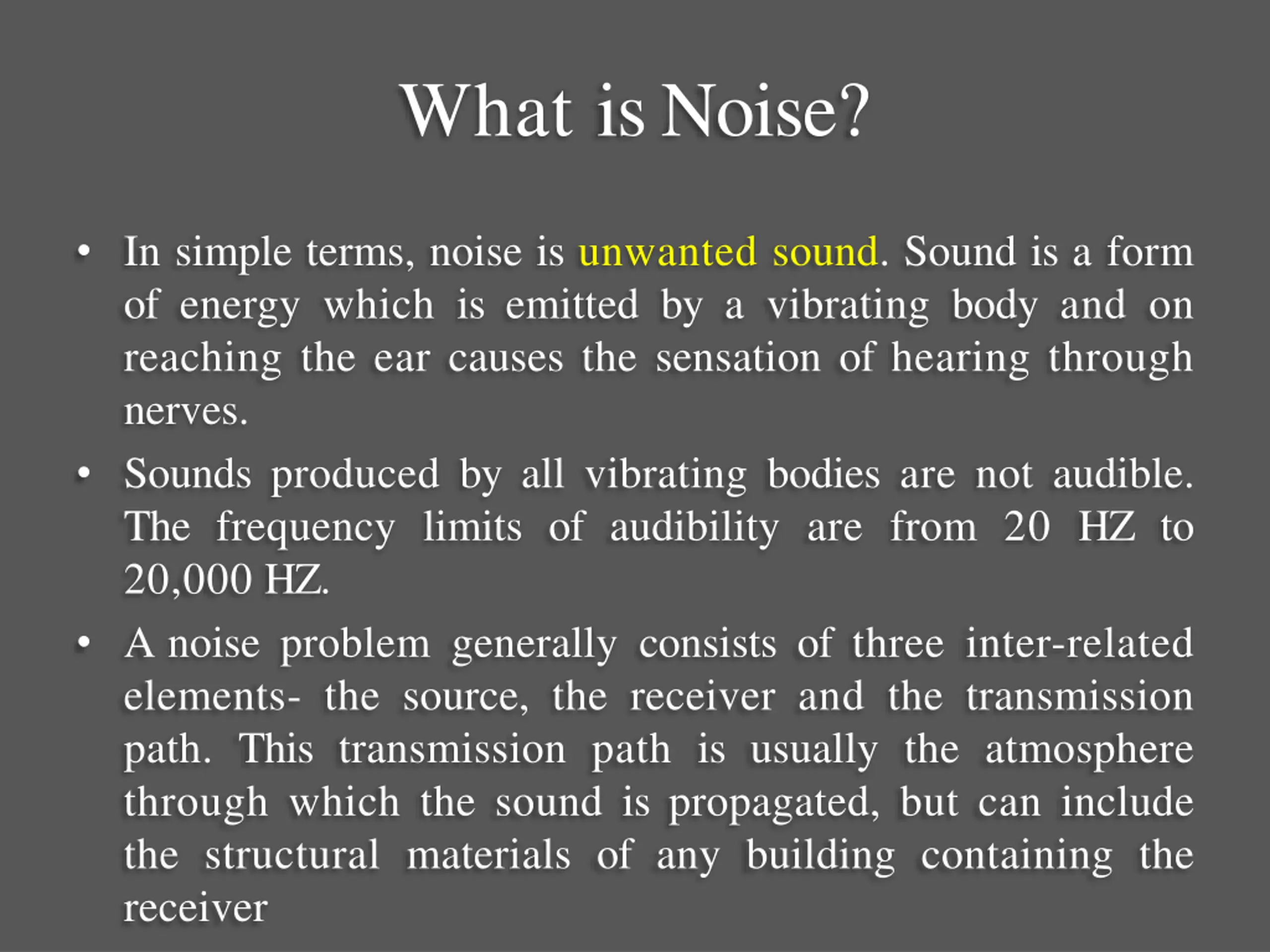 What isNoise? In simple terms, noise is unwanted sound. Sound is a form of energy which is emitted by a vibrating body and on reaching the ear causes the sensation of hearing through nerves. Sounds produced by all vibrating bodies are not audible. The frequency limits of audibility are from 20 HZ to 20,000 HZ. A noise problem generally consists of three inter-related elements- the source, the receiver and the transmission path. This transmission path is usually the atmosphere through which the sound is propagated, but can include the structural materials of any building containing the receiver