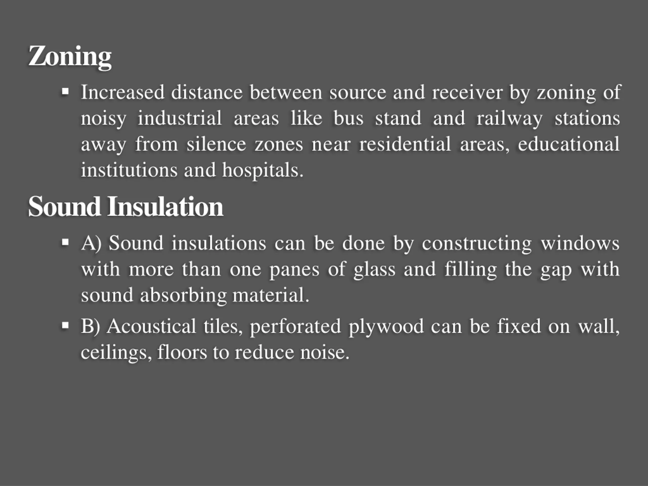 Zoning Increased distance between source and receiver by zoning of noisy industrial areas like bus stand and railway stations away from silence zones near residential areas, educational institutions and hospitals. SoundInsulation A) Sound insulations can be done by constructing windows with more than one panes of glass and filling the gap with sound absorbing material. B) Acoustical tiles, perforated plywood can be fixed on wall, ceilings, floors to reduce noise.