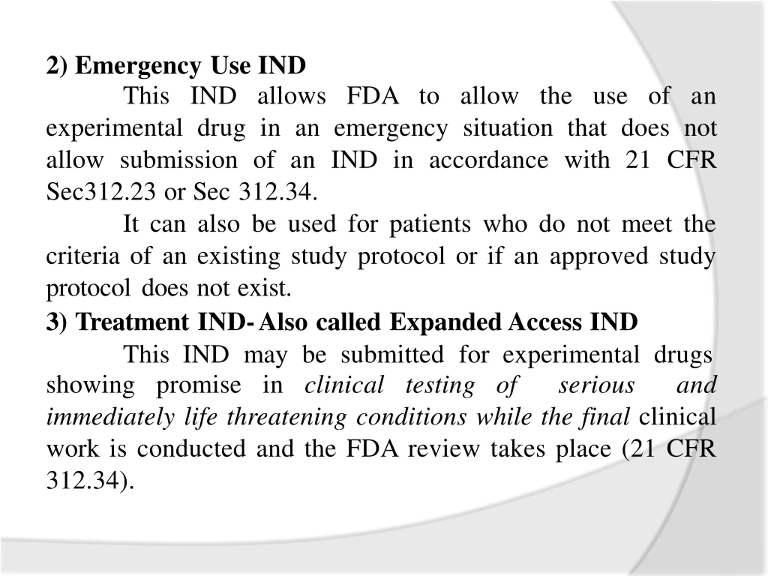 2) Emergency Use IND This IND allows FDA to allow the use of an experimental drug in an emergency situation that does not allow submission of an IND in accordance with 21 CFR Sec312.23 or Sec 312.34. It can also be used for patients who do not meet the criteria of an existing study protocol or if an approved study protocol does not exist. 3) Treatment IND-Also called Expanded Access IND This IND may be submitted for experimental drugs showing promise in clinical testing of immediately life threatening conditions while the final clinical work is conducted and the FDA review takes place (21 CFR 312.34). serious and