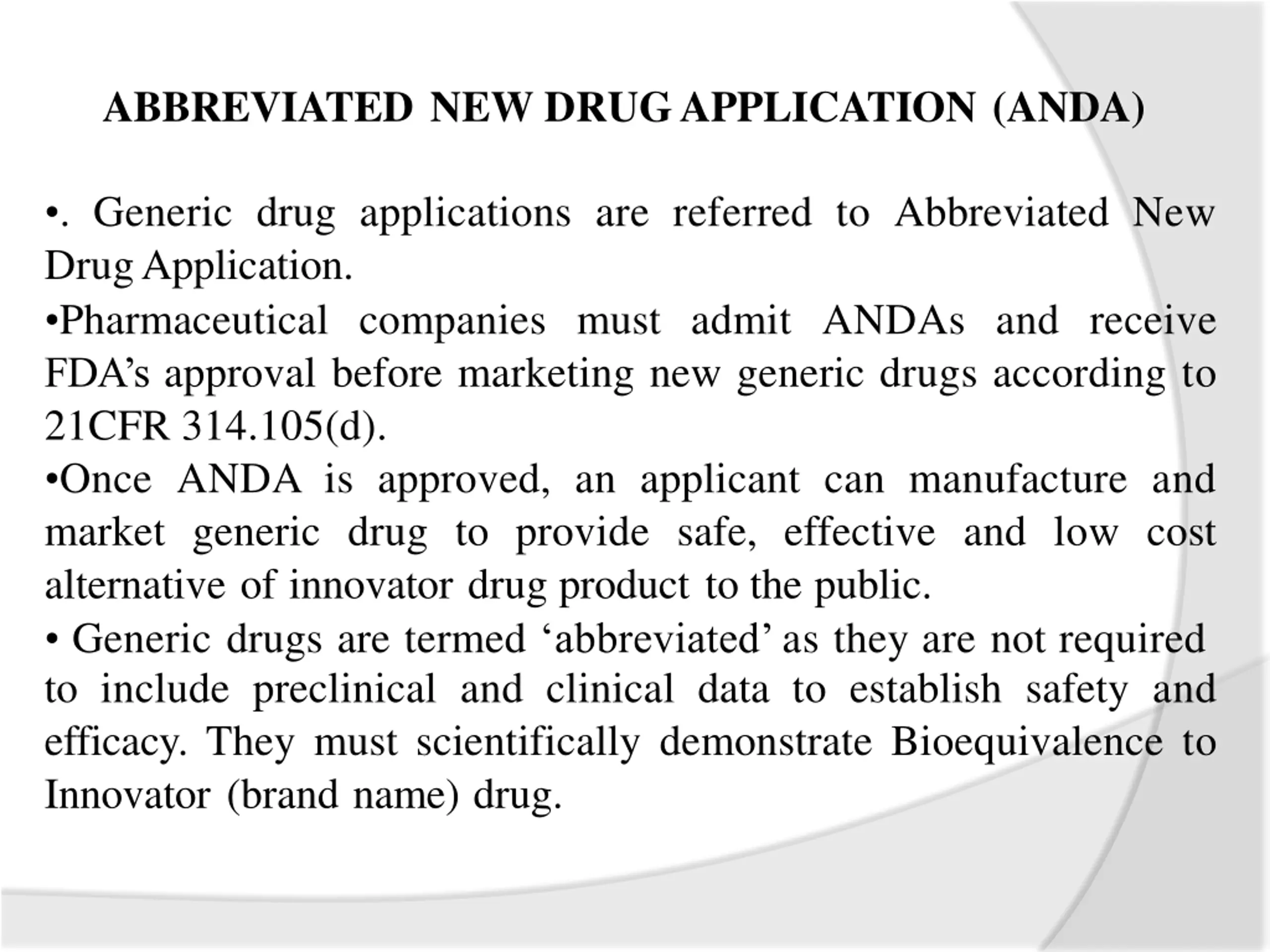 ABBREVIATED NEW DRUGAPPLICATION (ANDA) . Generic drug applications are referred to Abbreviated New DrugApplication. Pharmaceutical companies must admit ANDAs and receive FDA s approval before marketing new generic drugs according to 21CFR 314.105(d). Once ANDA is approved, an applicant can manufacture and market generic drug to provide safe, effective and low cost alternative of innovator drug product to the public. Generic drugs are termed abbreviated as they are not required to include preclinical and clinical data to establish safety and efficacy. They must scientifically demonstrate Bioequivalence to Innovator (brand name) drug.