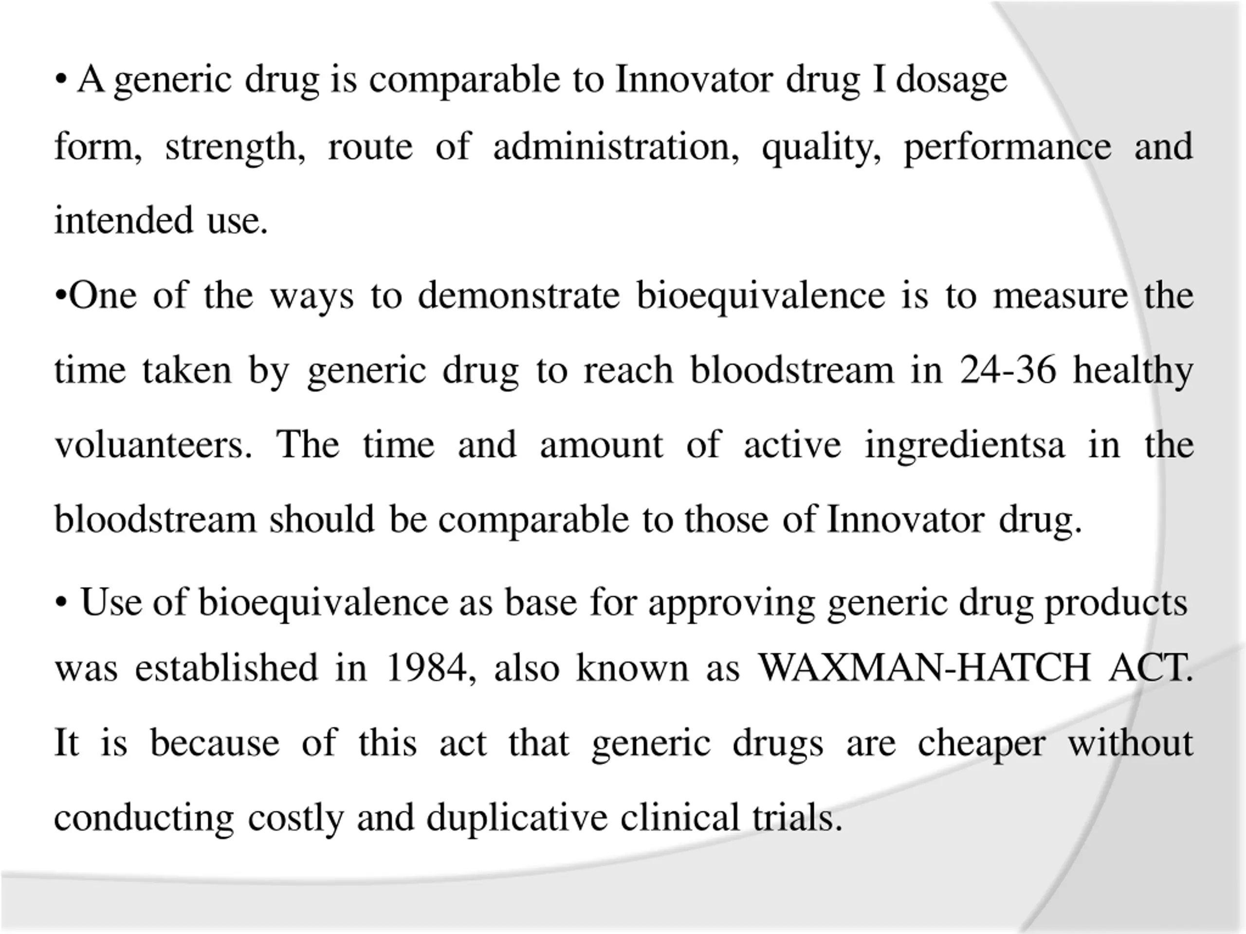 Ageneric drug is comparable to Innovator drug I dosage form, strength, route of administration, quality, performance and intended use. One of the ways to demonstrate bioequivalence is to measure the time taken by generic drug to reach bloodstream in 24-36 healthy voluanteers. The time and amount of active ingredientsa in the bloodstream should be comparable to those of Innovator drug. Use of bioequivalence as base for approving generic drug products was established in 1984, also known as WAXMAN-HATCH ACT. It is because of this act that generic drugs are cheaper without conducting costly and duplicative clinical trials.