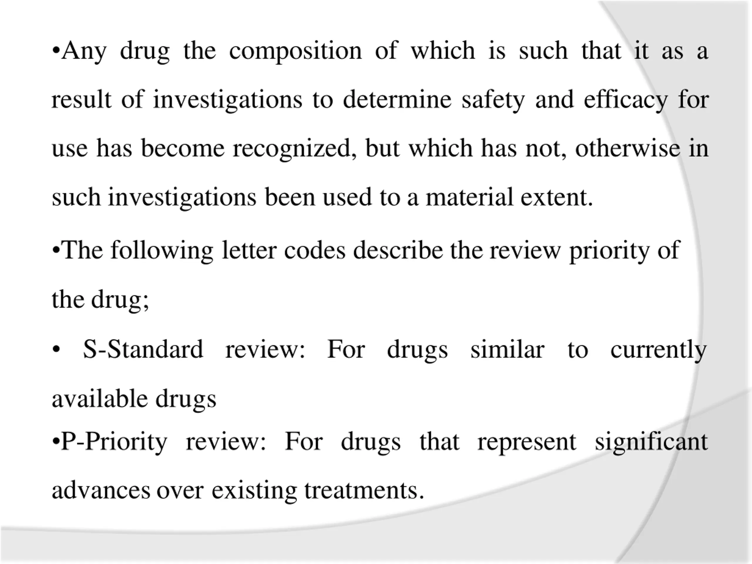 Any drug the composition of which is such that it as a result of investigations to determine safety and efficacy for use has become recognized, but which has not, otherwise in such investigations been used to a material extent. The following letter codes describe the review priority of the drug; S-Standard review: For drugs similar to currently available drugs P-Priority review: For drugs that represent significant advancesover existing treatments.