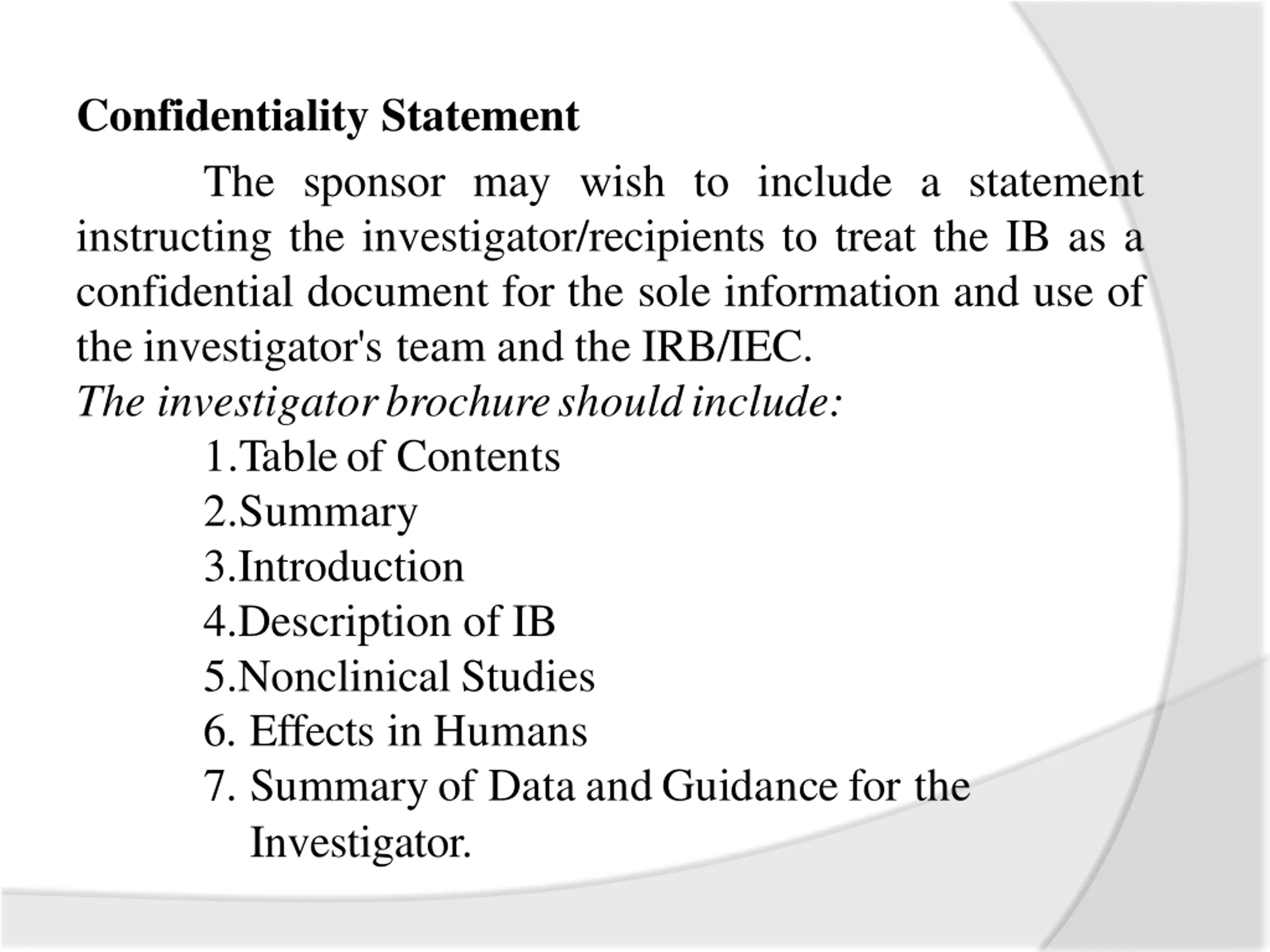 Confidentiality Statement The sponsor may wish to include a statement instructing the investigator/recipients to treat the IB as a confidential document for the sole information and use of the investigator's team and the IRB/IEC. The investigatorbrochureshouldinclude: 1.Tableof Contents 2.Summary 3.Introduction 4.Description of IB 5.Nonclinical Studies 6. Effects in Humans 7. Summaryof Data andGuidance for the Investigator.