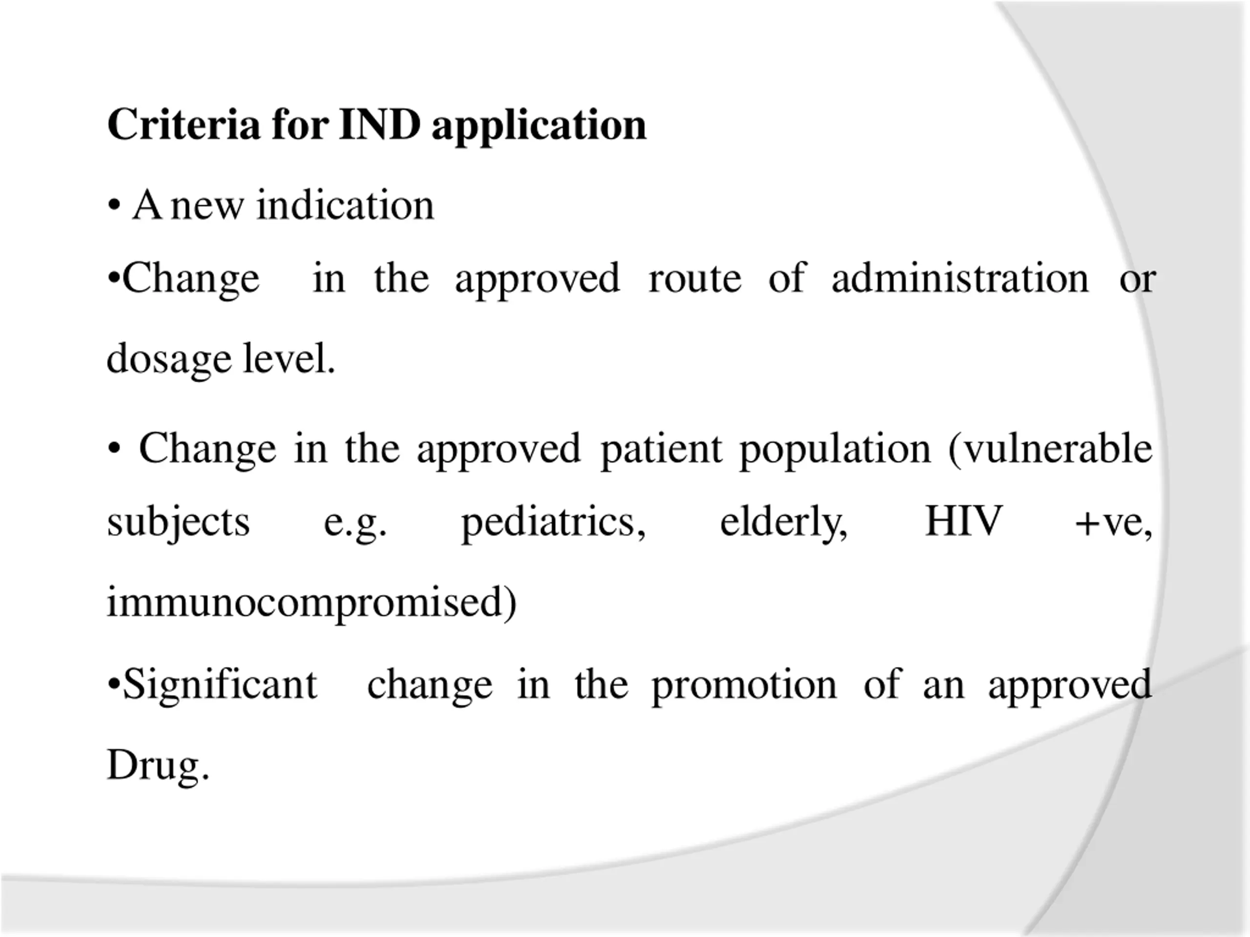 Criteria forIND application Anew indication Change in the approved route of administration or dosage level. Change in the approved patient population (vulnerable subjects e.g. pediatrics, elderly, HIV +ve, immunocompromised) Significant change in the promotion of an approved Drug.
