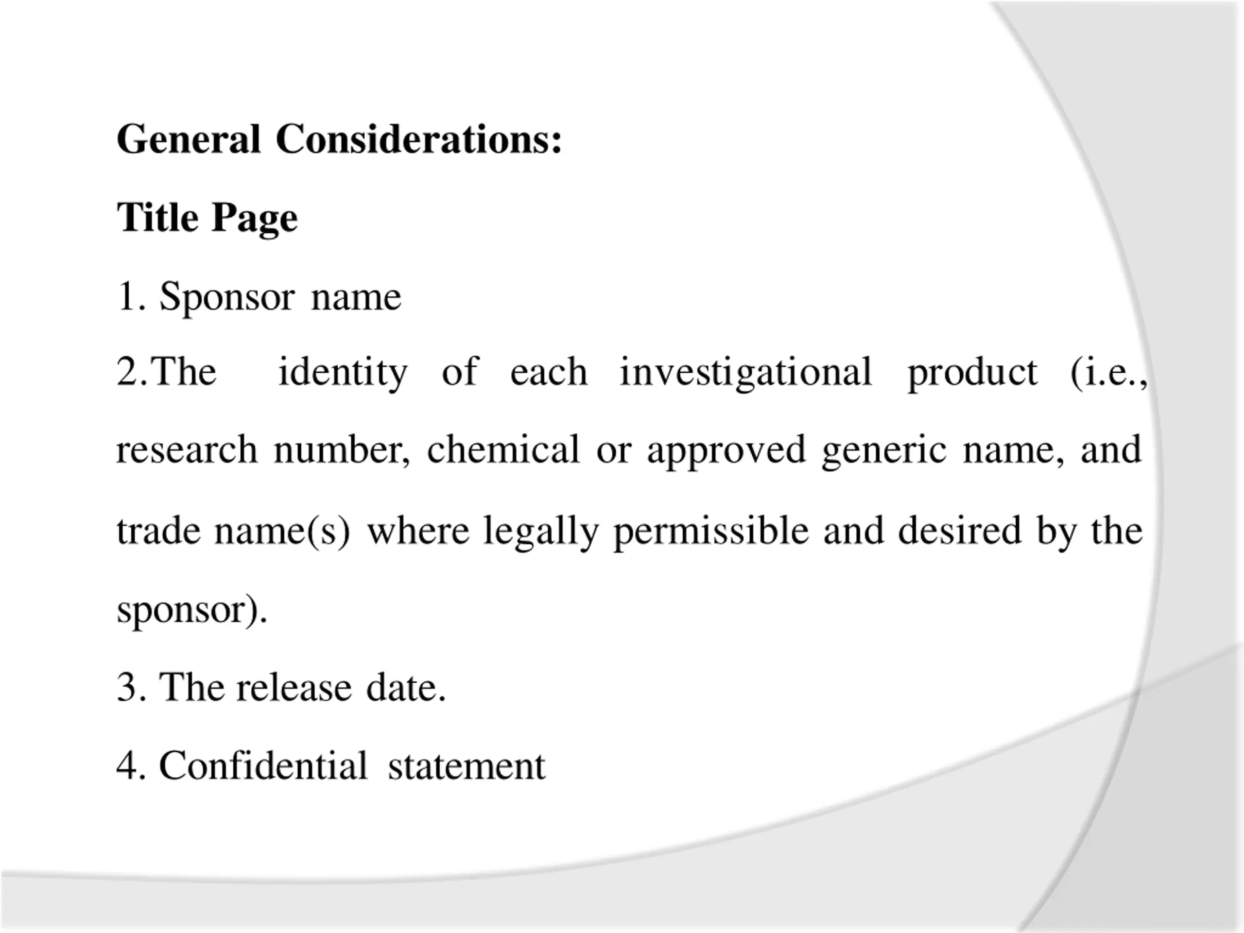 General Considerations: Title Page 1. Sponsor name 2.The identity of each investigational product (i.e., research number, chemical or approved generic name, and trade name(s) where legally permissible and desired by the sponsor). 3. The release date. 4. Confidential statement